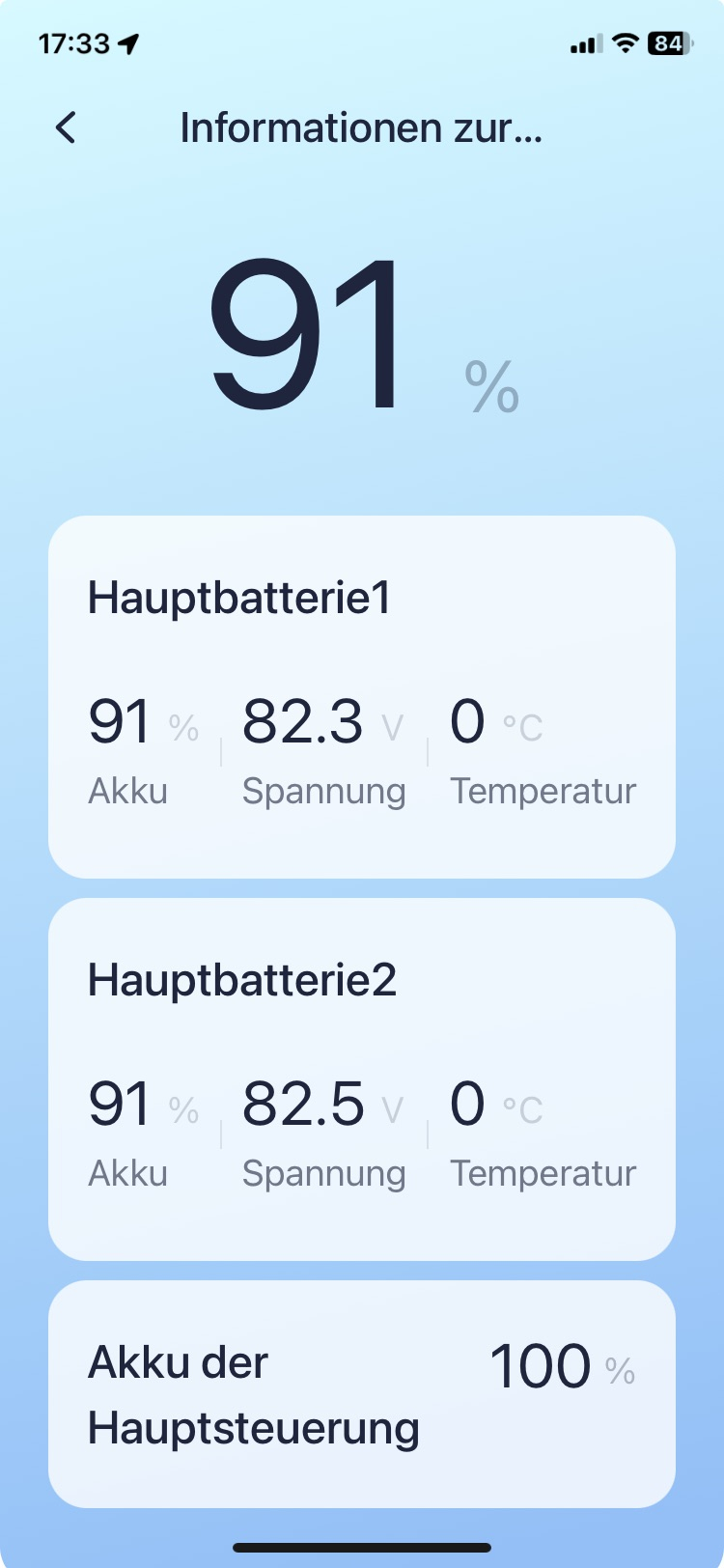 Merken sich die Akkus auch eine reduzierte Ladeleistung? Das wäre ja super interessant um mit geringerer Lautstärke in der Wohnung zu laden.hoschi_69 hat geschrieben: ↑Mo 15. Jan 2024, 20:58Die Anleitung bezieht sich immer nur auf die beiden Haupt Akkus und nicht auf den Steuer Akku
