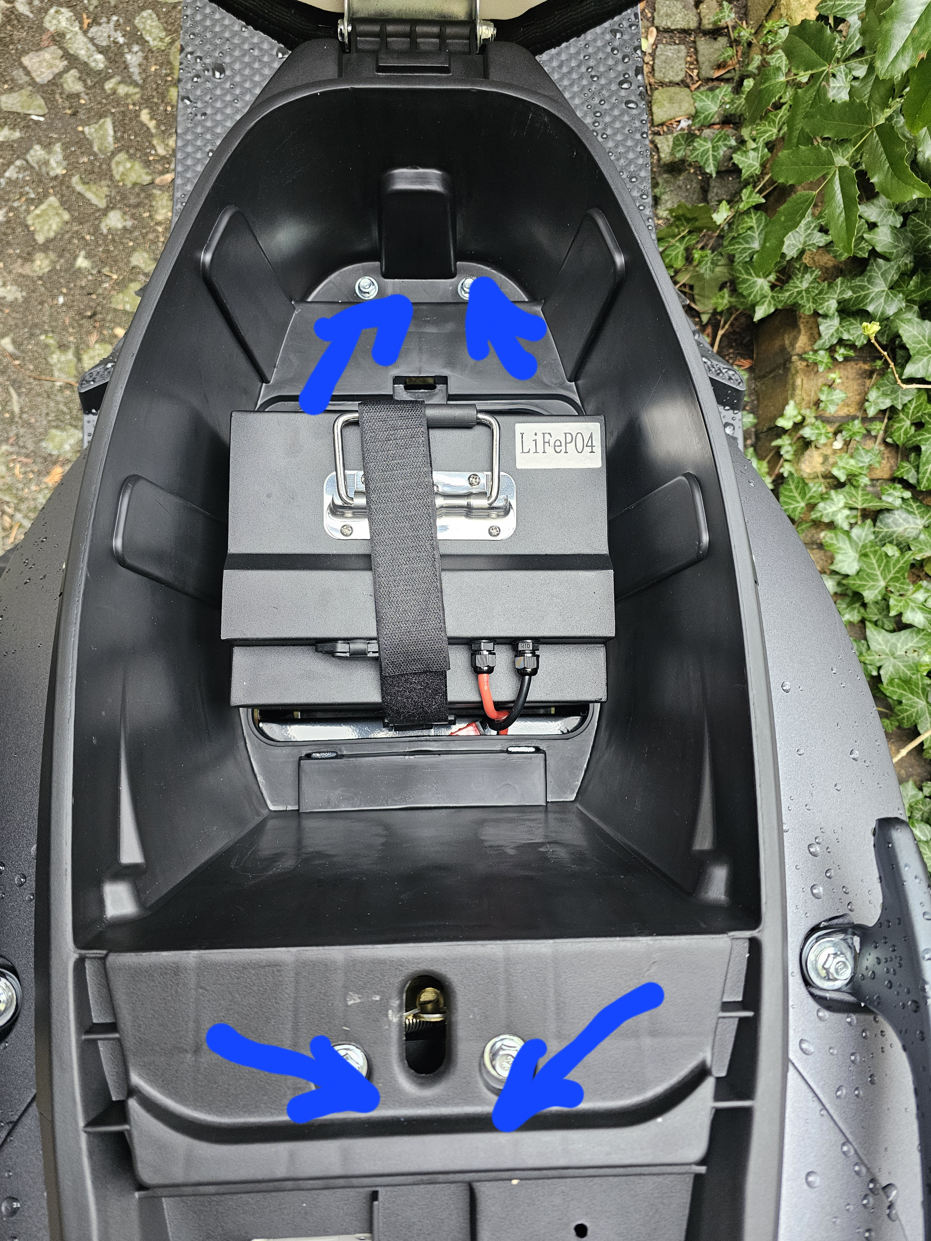 Den Stecker solltest du von unten ganz gut erreichen. Es ist ein roter Anderson Stecker. Bei unserem Vorführer ist das Kabel Rollerseitig lang genug um es anders zu verlegen wenn du den Akku erst mal raus bekommen hast. Um besser arbeiten zu können ist es Sinnvoll die Helmfachverkleidung zu lösen. Diese ist nur an den 4 Schrauben im Helmfach fest geschraubt.