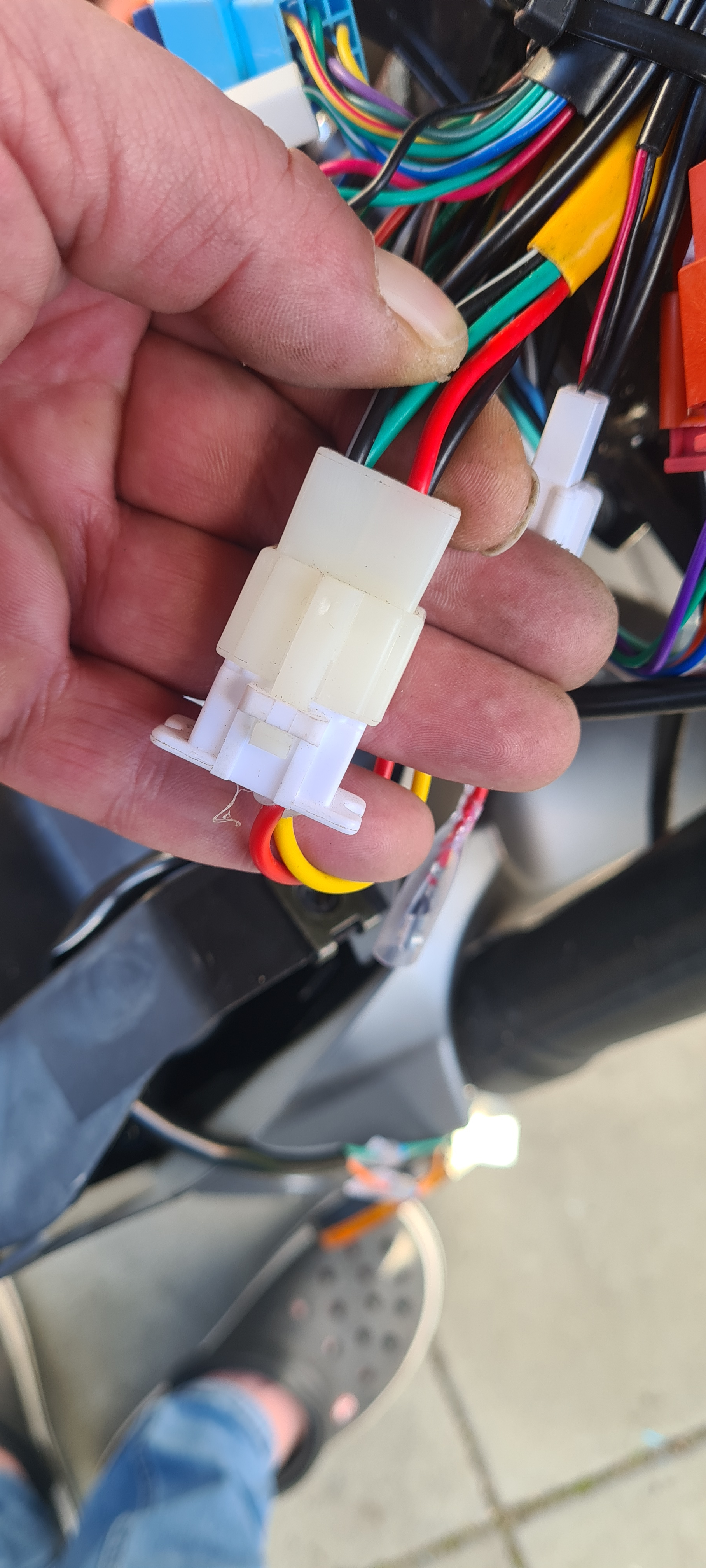 Üblich ist Gelb als Zündungs-Plus. Da gehe ich davon aus, dass das das Rote Kabel zum Zündschloss permanet auf 80 Volt liegt und das Gelbe Kabel nur dann, wenn Zündung AN wäre. Nur zwei Kabel gehen zum Zünschloss, wie üblich beim E-Fahrzeug. Gelb wird allerdings am Stecker zu einer anderen Farbe übergeben und die Leitung muss sich dann aufteilen zu mindestens drei Stellen.
