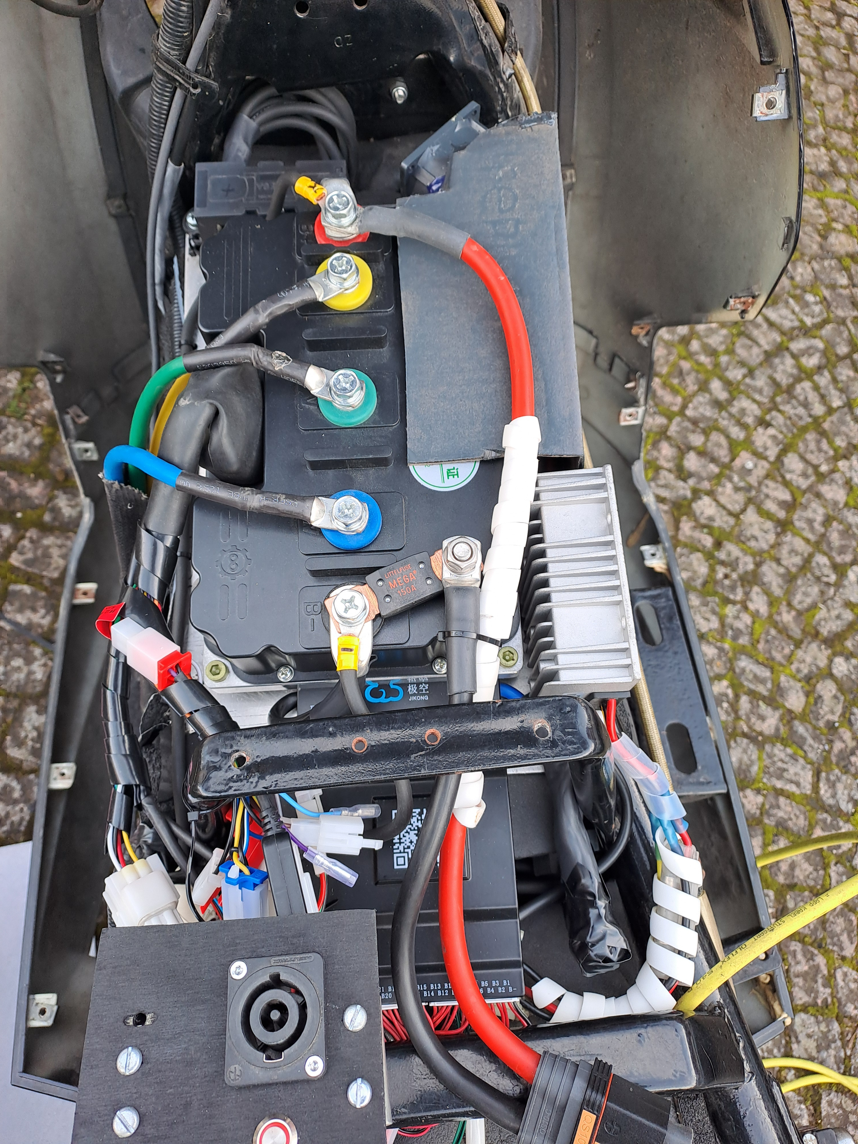 Somit zeigt er bei 20Grad nun 50Grad an statt vorher 80Grad. Bei 140Grad passt es dann ziemlich genau. Einem Lüftungskanal habe ich auch wieder gebastelt, damit dem Controller im Hochsommer bei Bedarf ordentlich durch die Kühlrippen gepustet werden kann. Lüfter ist nun doch der vorherige 60mm 18W Axiallüfter geblieben. Den 70mm Radiallüfter mit 10Watt hört man unterm Helm bei Tempo 50 nicht, somit fehlte mir die Rückmeldung. Den Kabelbaum vom Controller habe ich vorerst mal belassen wie er ist, da sind aber 2/3 der Leitungen überflüssig, was einen Blumenstrauß an Steckern nach sich zieht.