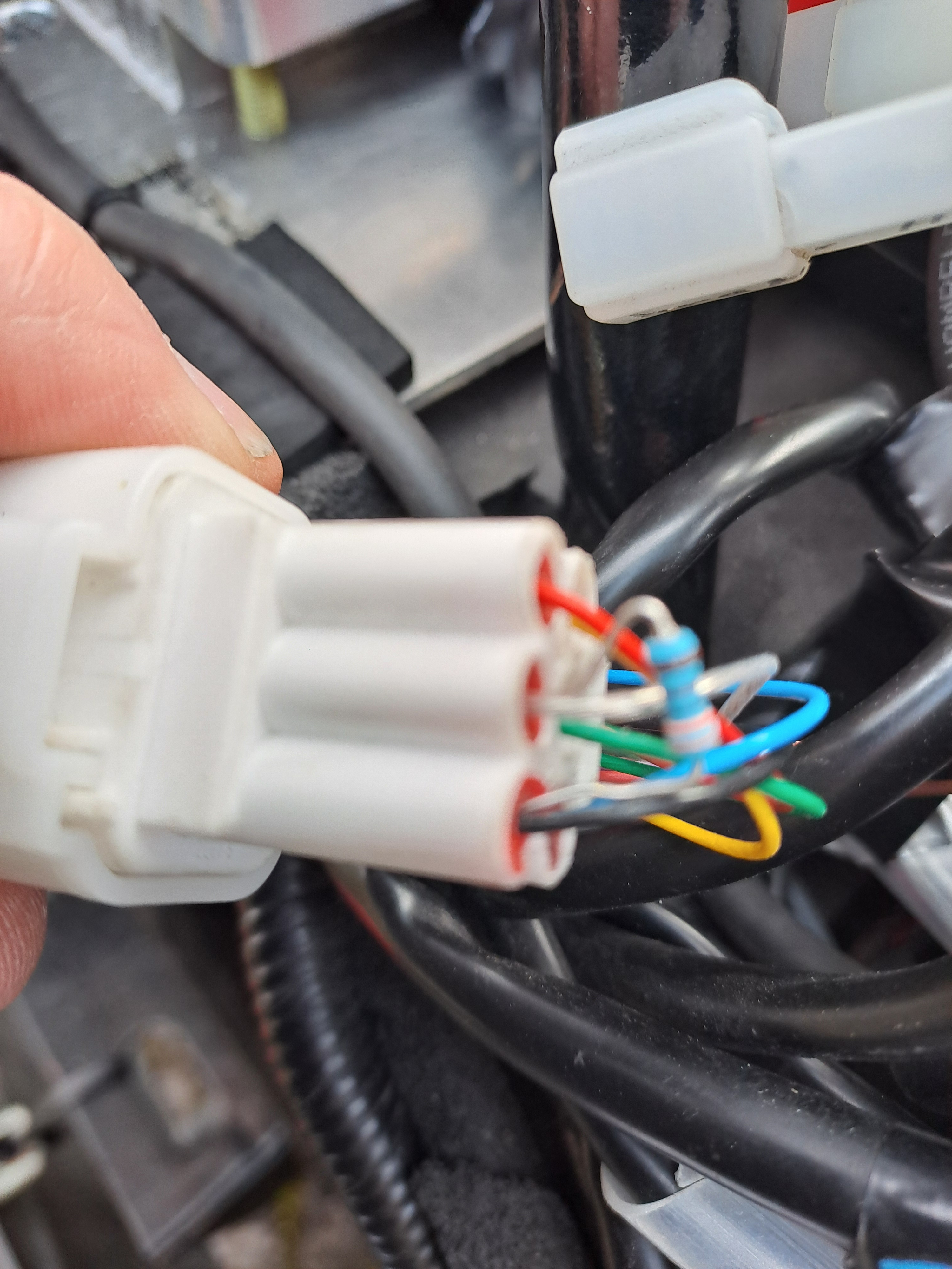 Ich habe den schlecht verpressten Steckkontakt an der Zugentlastungsvercrimping etwas geöffnet und den Draht vom Widerstand da mit untergeklemmt und vorne dran am eigentlichen Crimp zur Sicheheit noch angelötet.