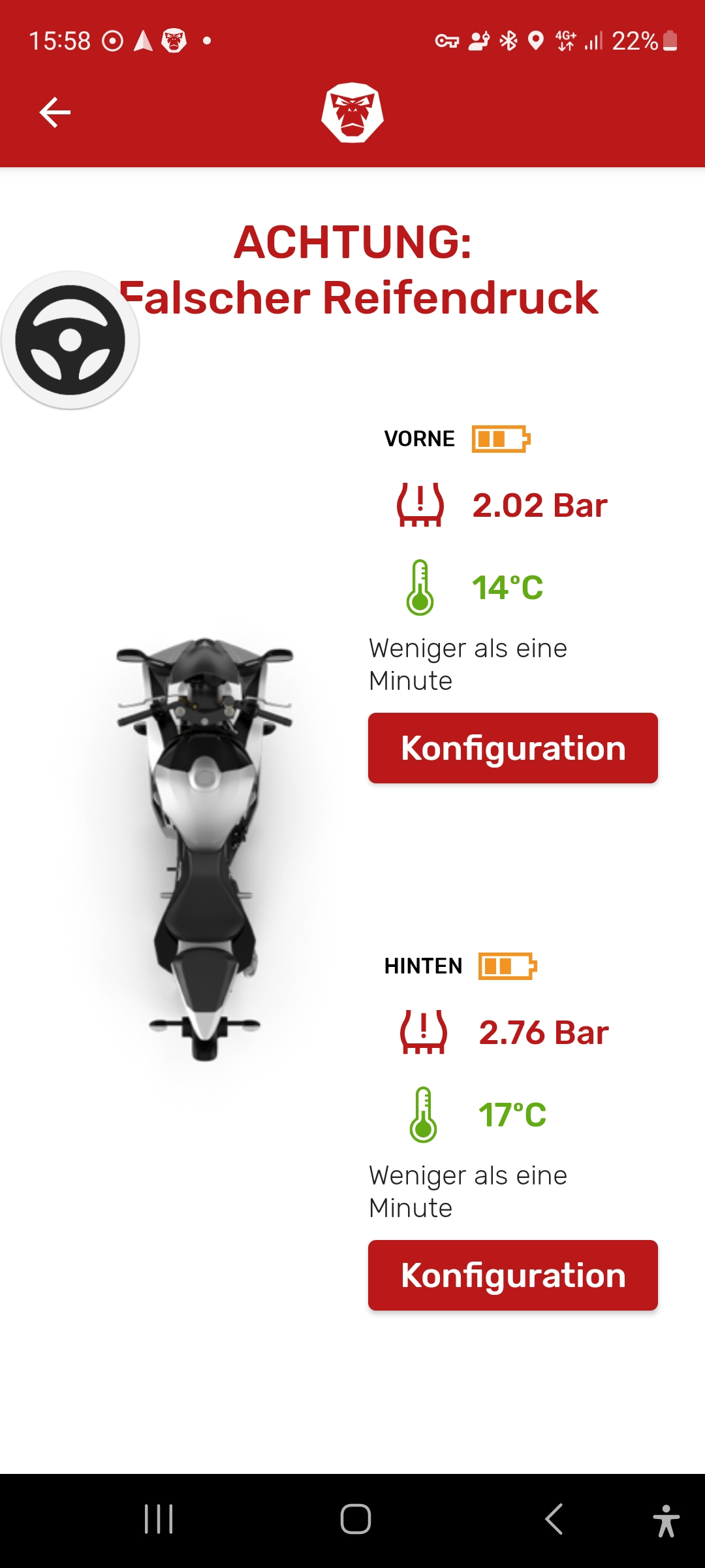 Der Reifendruck ist im kalten Zustand zu messen und korregieren.