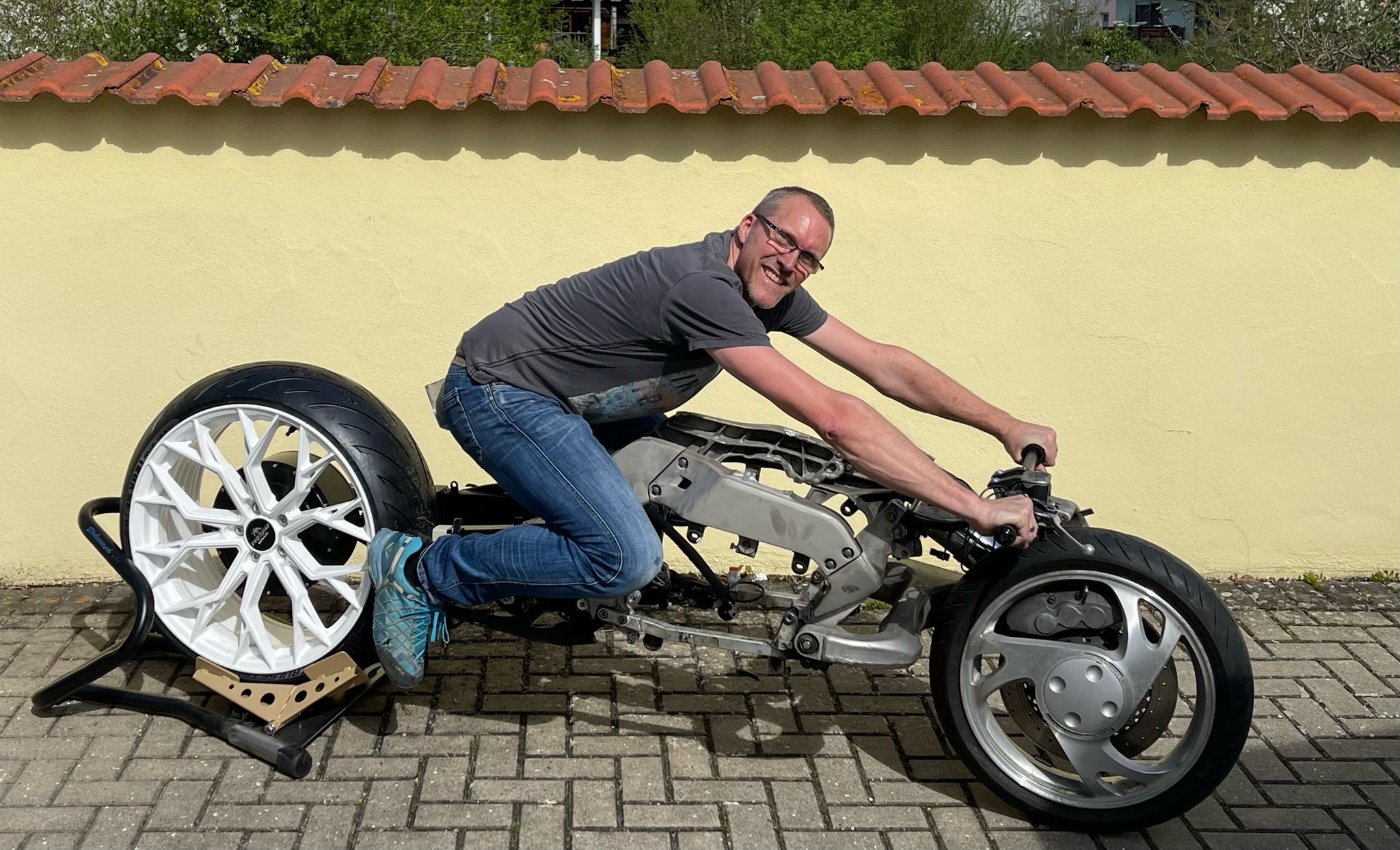 Wozu willst Du so einen MONSTRÖSEN Vorderreifen? Der muss doch nur steuern, die Richtung vorgeben. OK, hinterher bremsen muss er auch noch, aber muss er deshalb so fett sein?