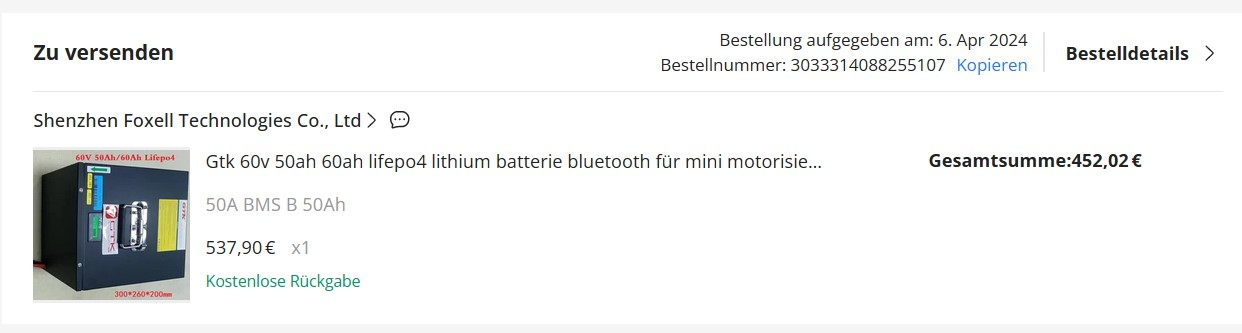 Ps. die Lieferzeit für den Gtk 60v 50ah Akku, ist wegen Störungen im Schiffsverkehr, von 50-70 Tagen auf 90-100 Tage erhöht worden.
