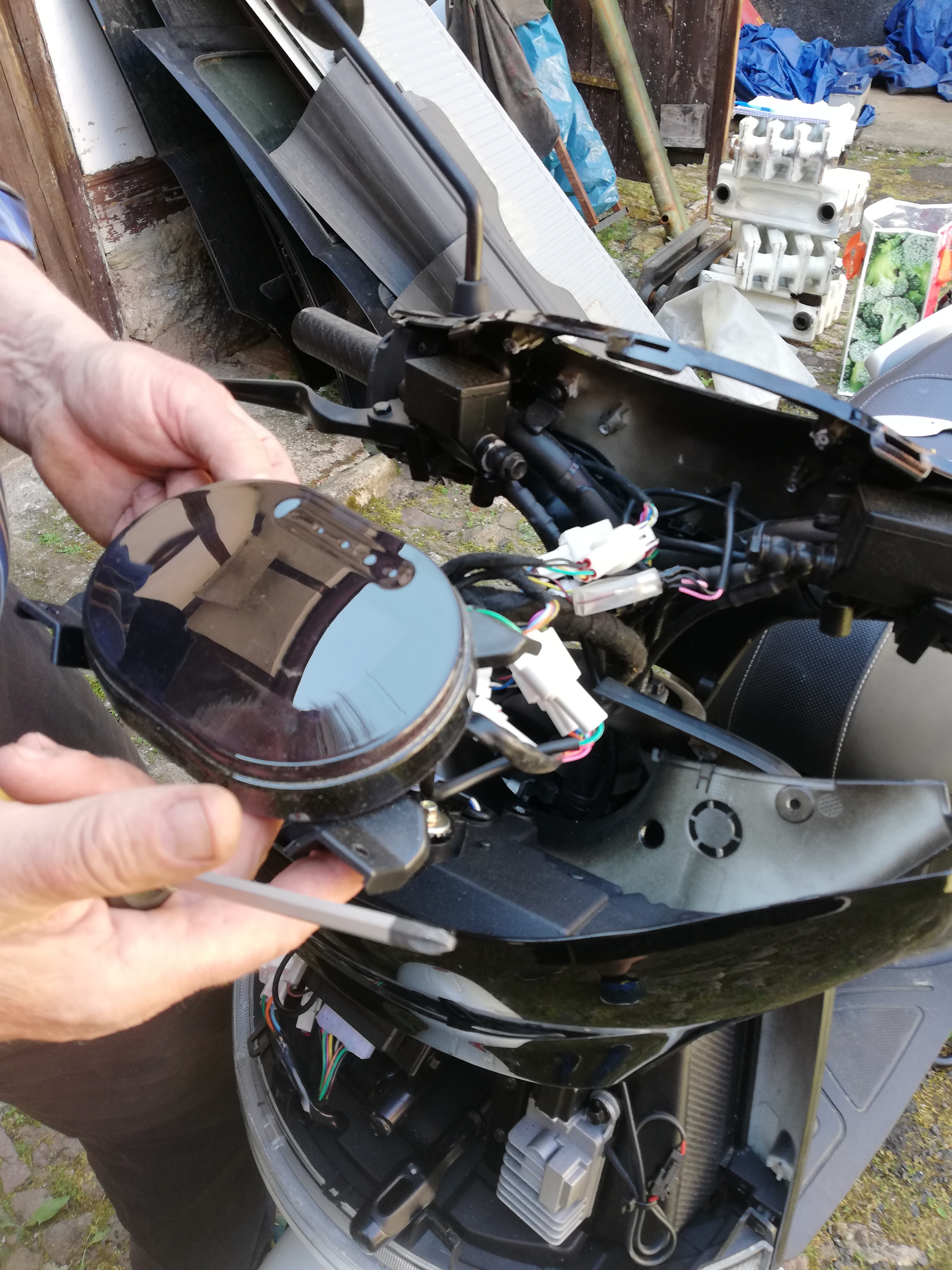 Die beiden Schrauben seitlich von den Bremshebeln waren nicht vorhanden bei mir. Der Kilometerstand ist nun wieder auf 0 (vorher 5615 km, das war noch lesbar). Die Verkleidung wurde mittels eines Parmesanmessers und eines Schraubenziehers gelöst.