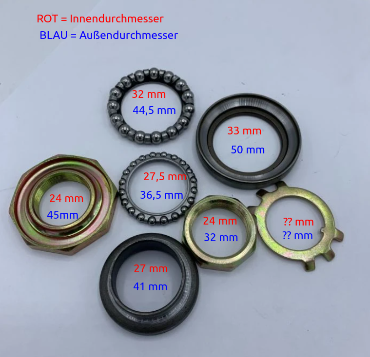 Ich habe mir gestern noch den Lenkkopflagersatz bestellt. Zum meiner Überraschung lag das Paket heute schon vor der Türe. ABER: Es fehlt ein Teil im Set. Und zwar das folgende, rot gekennzeichnete: