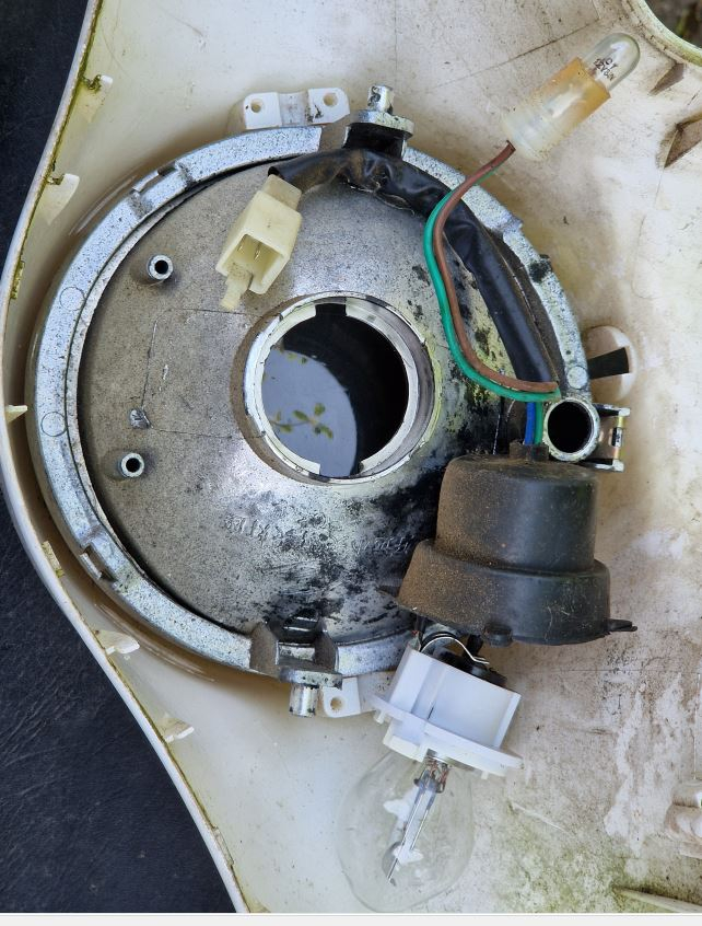 Die kleine Birne im Scheinwerfer ist nur reingesteckt, die Grosse muss man drehen. Interessanterweise gibt es hier ein Gewinde, aber das wird nciht genutzt, sonder nur ein Gummistulp.