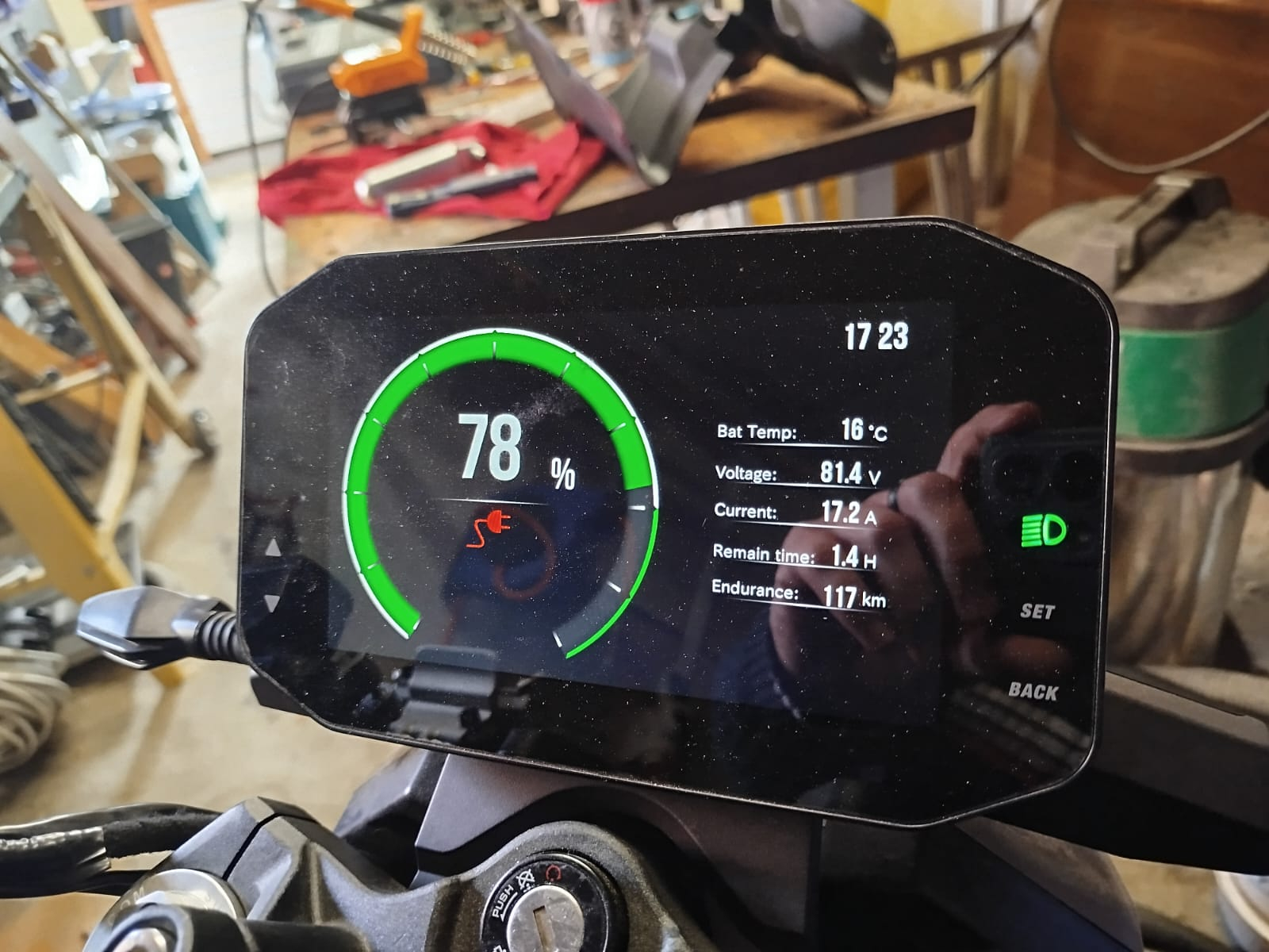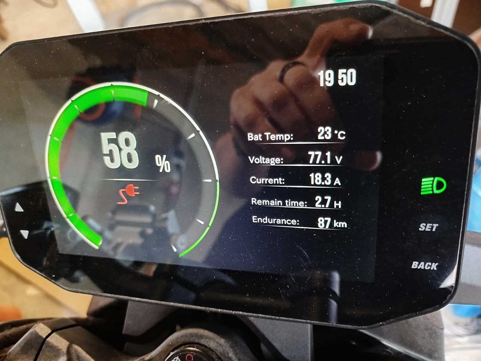 Es hat mich gewundert warum der Lader nicht mit 20A lädt so wie es auf dem Typenschild steht. Dann habe ich beim Laden eine Messung des Ladestromes gemacht. Da gibt es eine Abweichung von ca. 1,3 A. Das Display zeigt weniger Ladestrom an. Am Anfang des Ladevorganges lädt es mit 19A laut Display, ab ca. 70% wird der Strom gesenkt, zum Ende hin Lädt es mit noch guten ca. 16A.