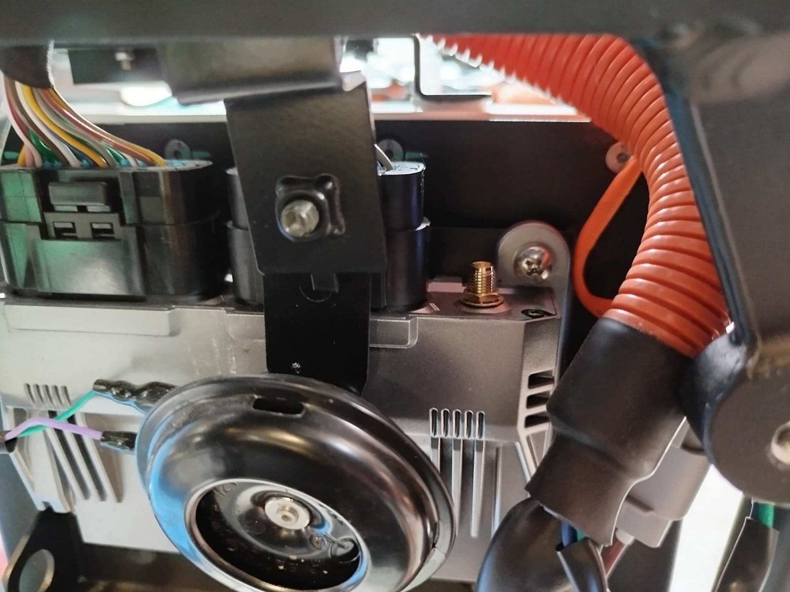 Als letztes ein Bild des vorderen Steuergerätes. Es scheint einen Anschluss für eine Antenne (Wlan, GPS?) zu haben. Aufkleber ist bestimmt auf der Rückseite.