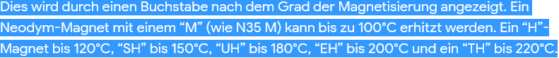 Neodymmagnete ohne extra Kennzeichnung haben eine max. Dauertemp. von 80°C oder sogar weniger. Welche, die mehr aushalten, sind mit entspr. Buchstaben gekennzeichnet (M=100°C, H=120°C, SH=150°C, usw.)