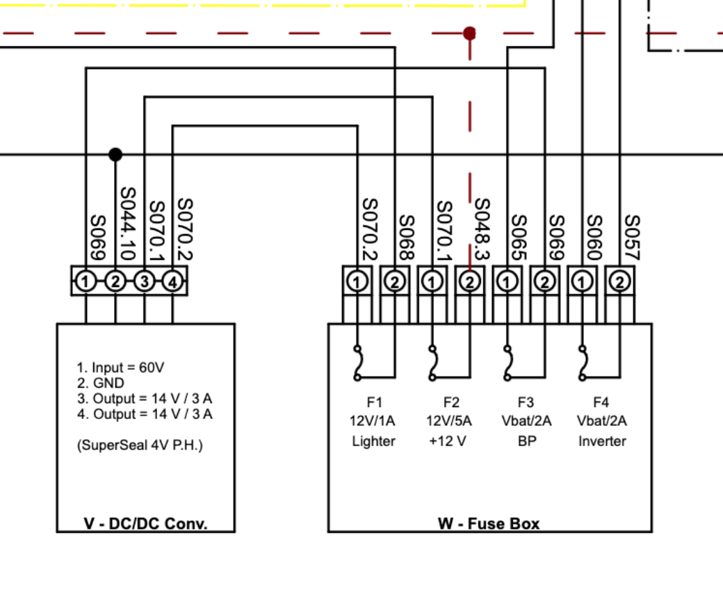 Dieser Teil der Silence/Mo ist relativ simpel: 60V liegen an und 2x 14V gehen raus. Die VBat E Leitung geht direkt von der Batterie über die Sicherung F3 an den DC-DC. Mehr hängt da nicht dran. Allerdings geht tatsächlich nicht viel, wenn das mit dem Output nicht klappt. Auch die ECU wird über den DC-DC versorgt, und von dort dann das Dash.