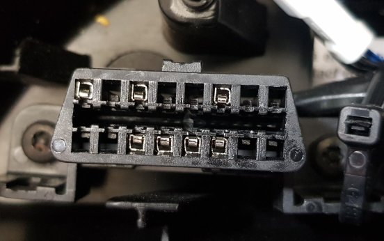 Wenn man sich die Mühe macht und die OBD-Buchse mal aufmacht, findet man nicht viele bestückte Kontakte darin. Die beiden am meisten in der Mitte liegenden auf einer Seite sind GND.