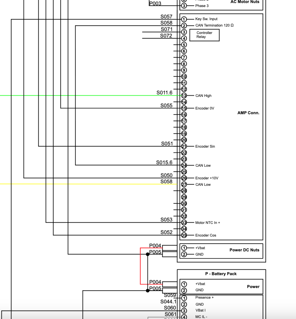 S057 geht vom Sevcon zum Sicherungskasten F4/2A , von dort zu S060 VBat I am Multikontakt der Batterie.