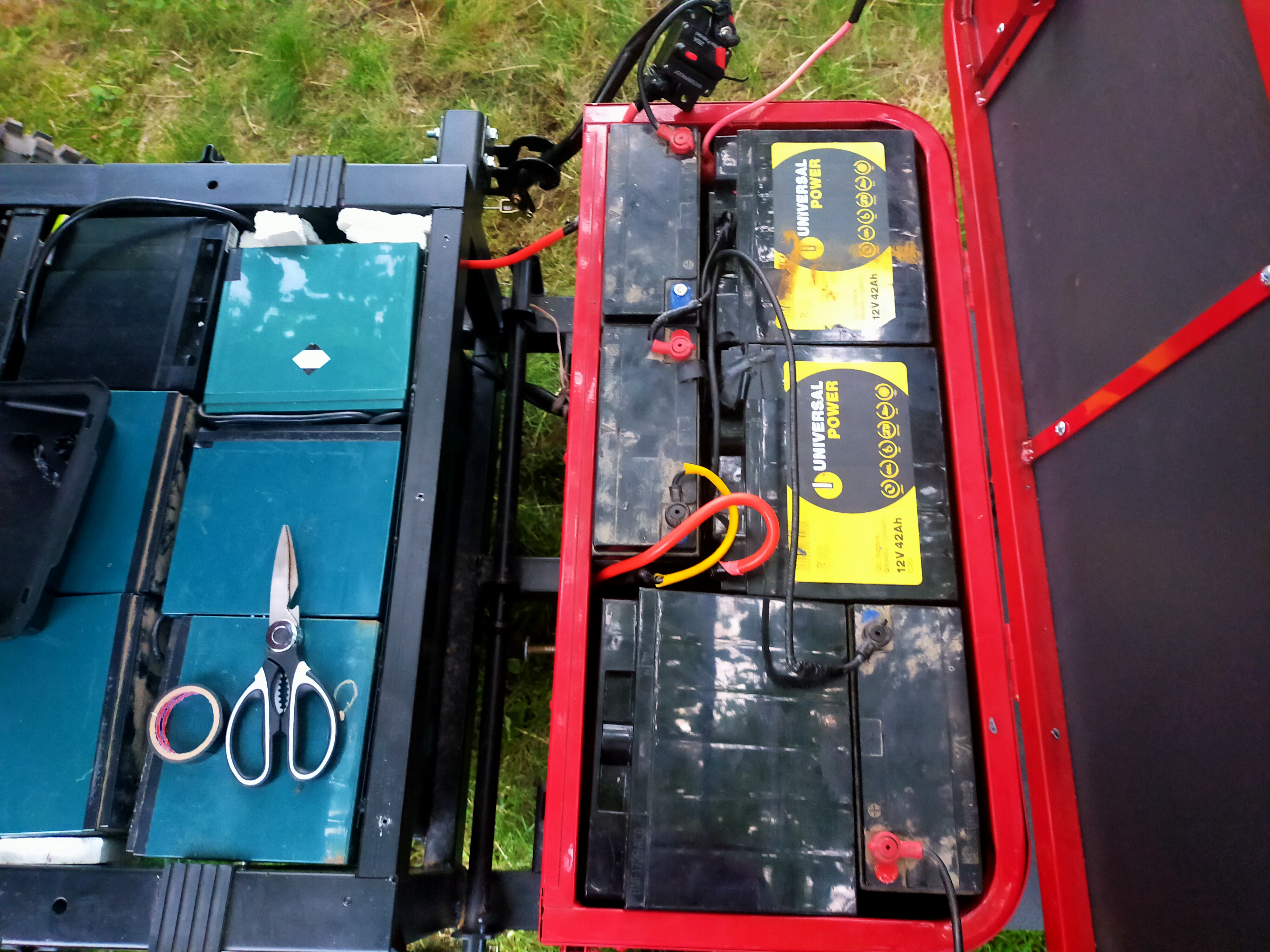 Bis 22:15 Uhr baute ich weitere 6 Batterien,12V 20 Ah als einen String und 6 Batterien 12V 42 Ah als einen weiteren String, in die Kiste unter dem Fahrersitz ein. Insgesamt verfügt der VT5 5 jetzt über 4 parallele 72V Strings mit 60 Ah als original. ( vermutlich fake Akku mit tatsächlichen nur 45 Ah) und von mir eingebauten 42 Ah und 20 Ah und nochmals 20 Ah. Mehr Platz ist nicht im Batteriekasten und der Fahrersitzkiste. Es sind alles Bleigel Akku, weil ich bei Minusgraden die Akku laden muß und ich somit keine LiFe Po4 Akku verbauen kann.