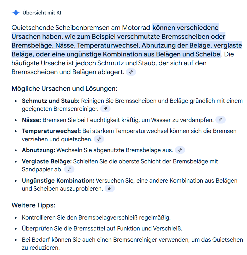 Wenn man bei Google quietschen scheibenbremse motorrad eingibt erscheint folgendes: