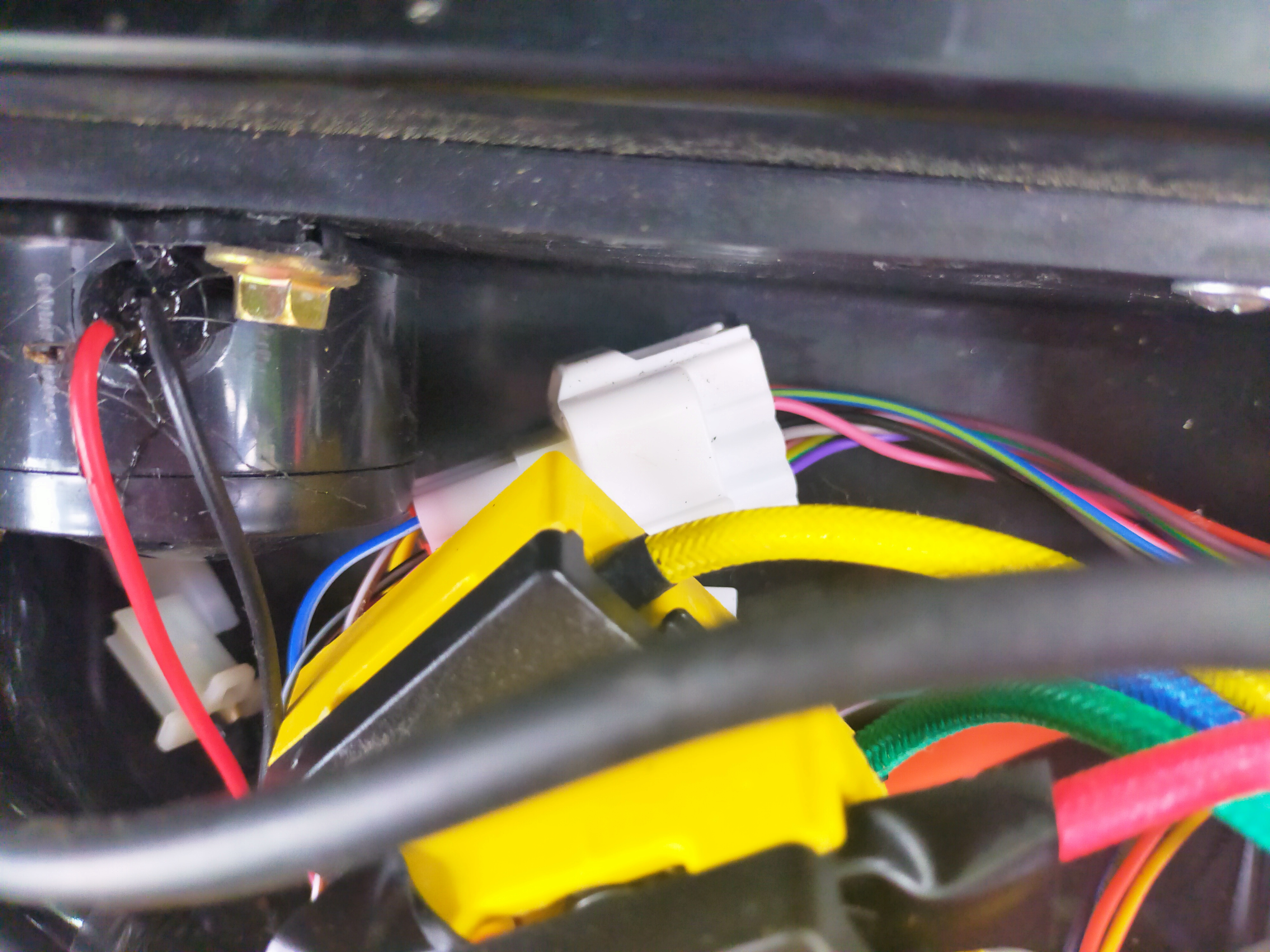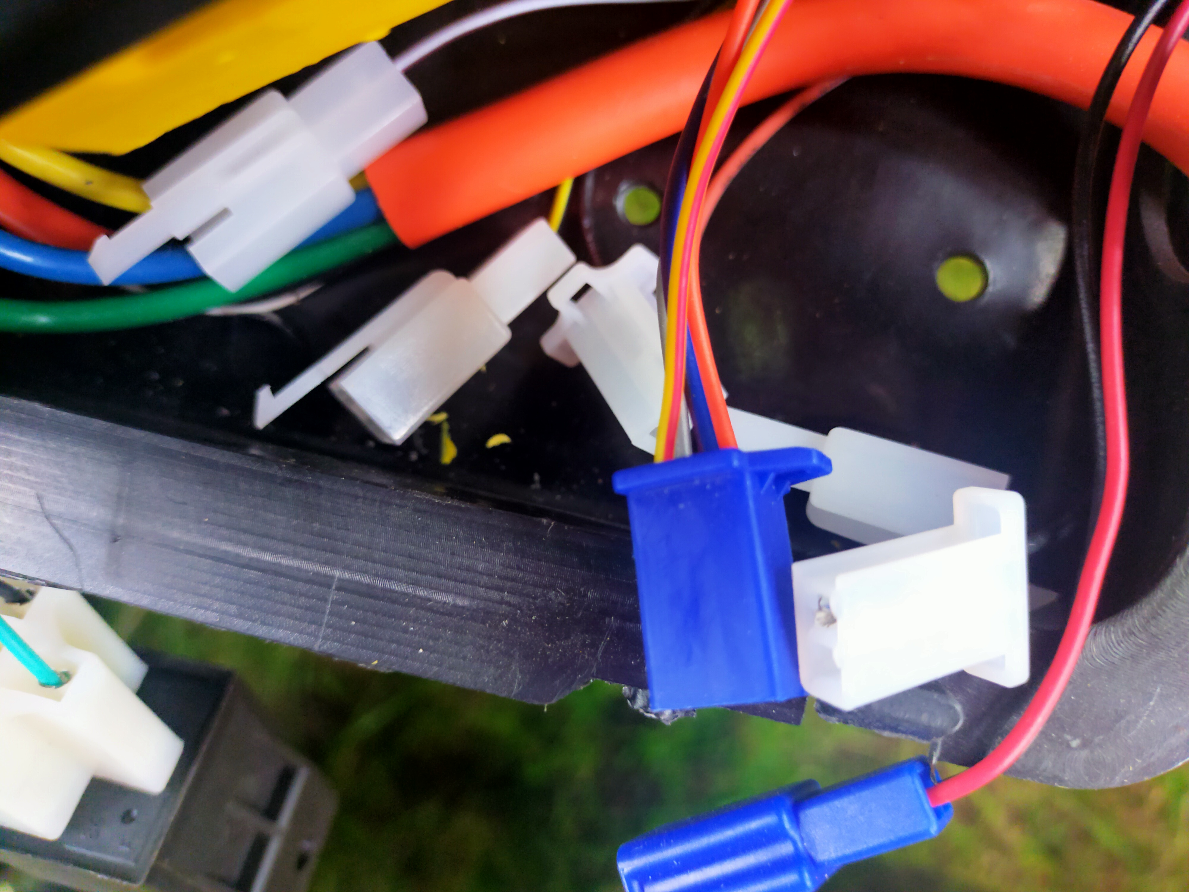 Ich habe photographiert, um anhand der Aufnahmen herauszufinden, ob high Break ( Recuperation ) oder Low Brake ( einfach nur die Stromunterbrechung mittels einer der Schalter am Bremshebel; hat die Fußbremse überhaupt einen Kontaktschalter ? ) an den Controller angeschlossen ist. Keine Kabelbeschriftung. Ich weiß es letztendlich nicht. Kann das jemand anhand der Fotos erkennen?