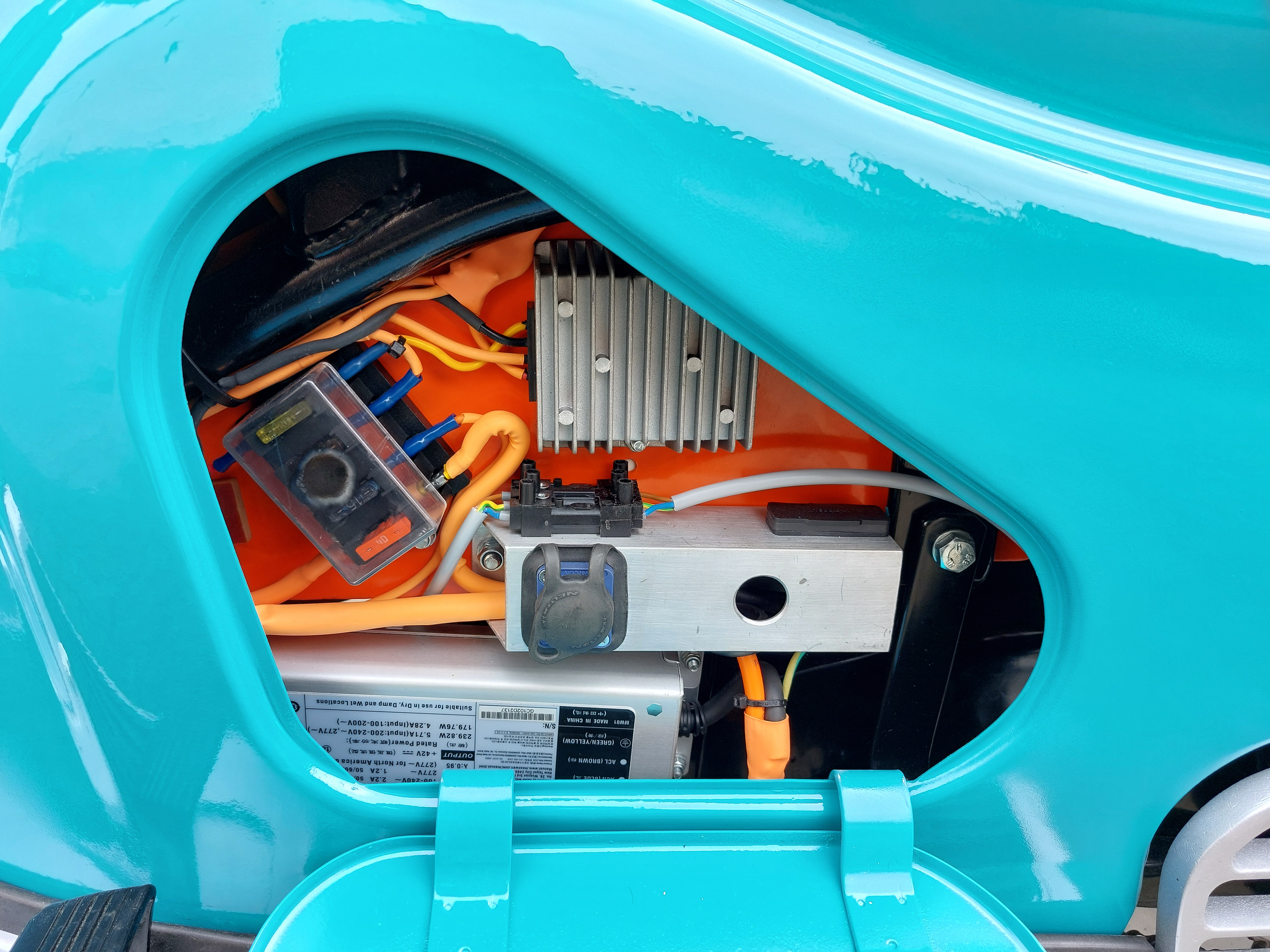 Der NTC (oben links im Bild) vor dem Zündschluss/DC/DC Wandler, der sitzt halt in zwei Lagen orangem Schrumpfschlauch. Die steckbare Lüsterklemme ist das Rücklicht, damit das Blechkleid schnell entfernt werden kann.