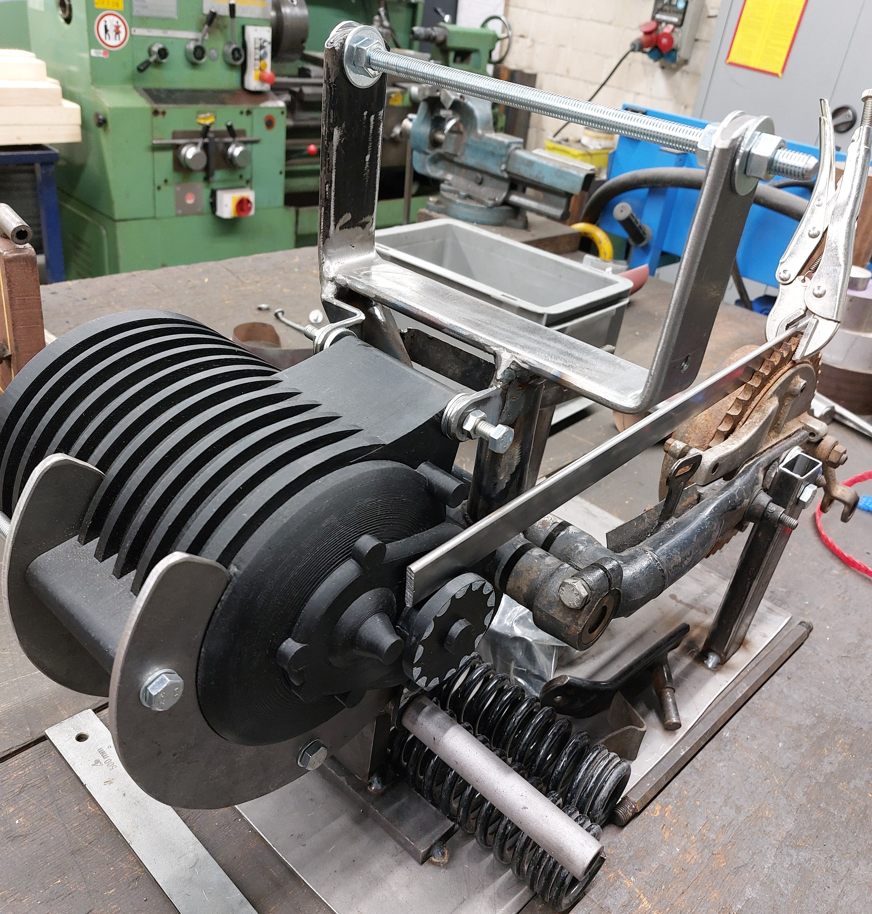 Erster Testlauf auf der "Rolle" mit Feldschwächung werden Tacho 90 erreicht, hier wird das Ritzel noch von 14 auf 15Zähne vergrößert, damit auch sicher die ursprüngliche Geschwindigkeit auf der Straße erreicht wird.