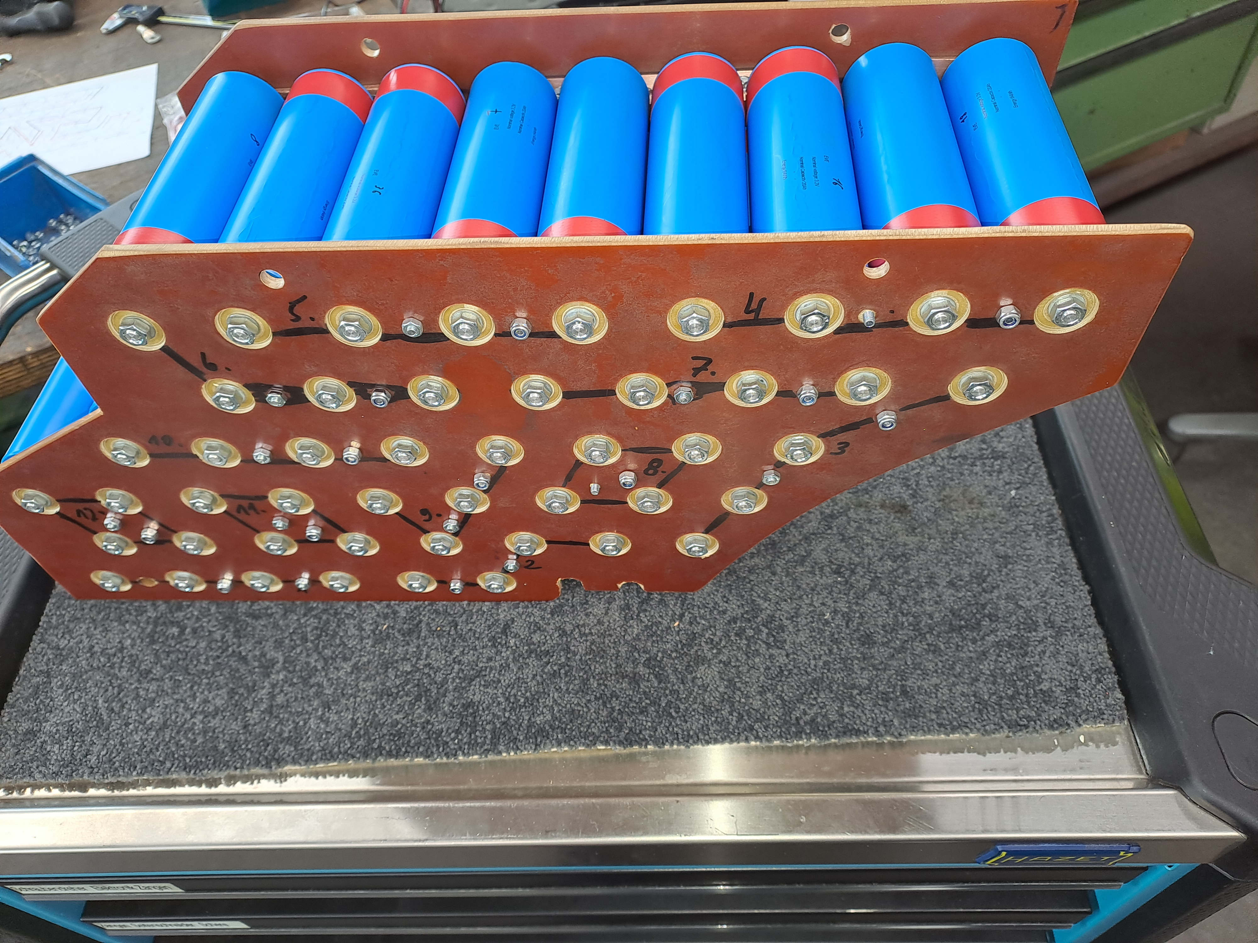 Geplant war ursprünglich 24S3P, also 72V 60Ah, dann wäre der Block aber nicht mehr einfach entnehmbar gewesen.