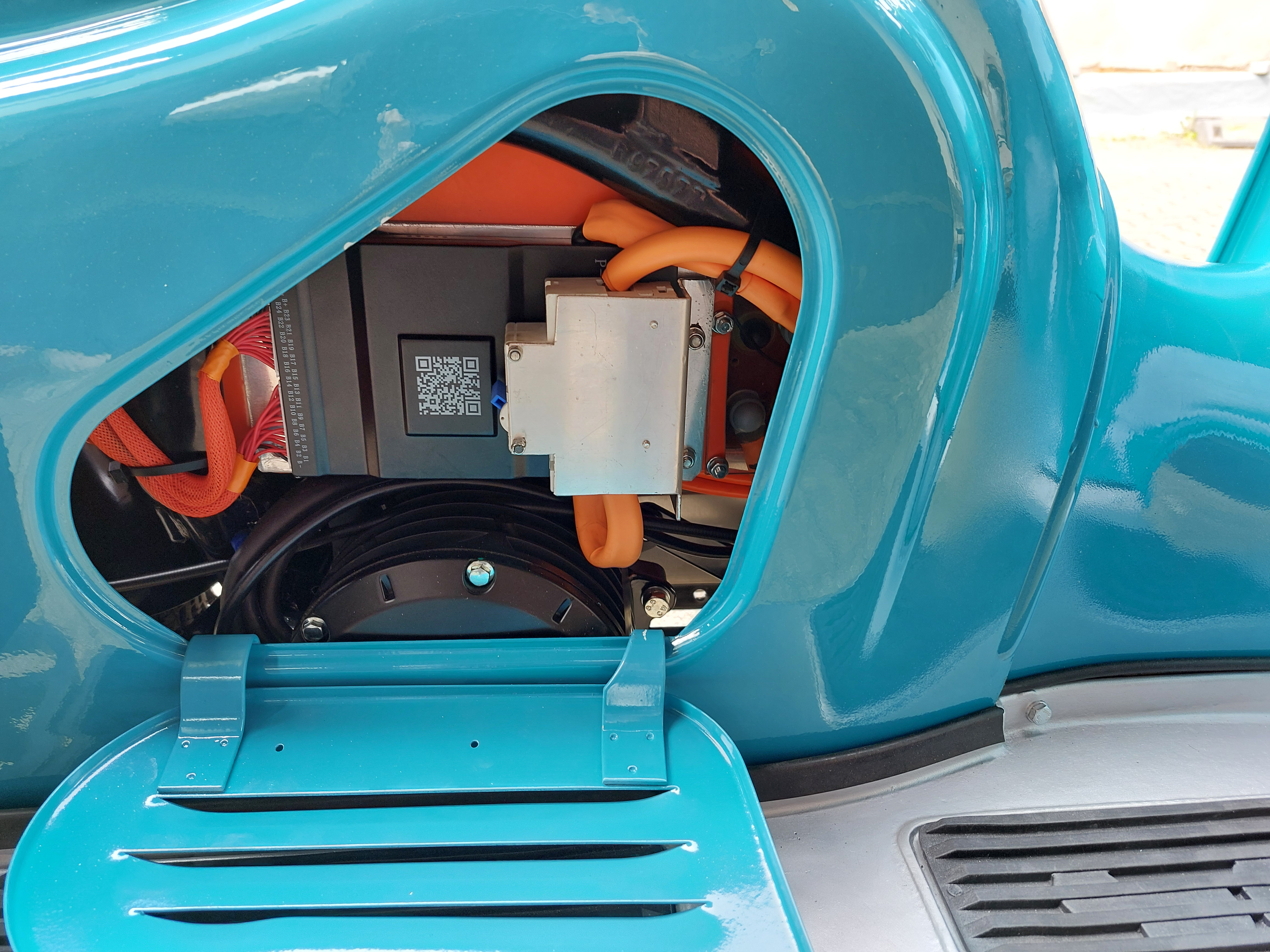 Auf dem Bild fehlt noch das mit einem normalen Gaszug betätigte Hallgas , damit am Lenker die originalen Armaturen weiter verwendet werden können. Mit Kettenkasten Batterieaufbau Die Batterie wurde so aufgebaut das Minus und Plus vorne rechts unten ankommen, damit man bei Bedarf von einer Seite her nur einen Plexi-Deckel und zwei Kabelschuhe und die BMS Stecker lösen muss um sie zu entnehmen. Alle Teile im Roller verbaut