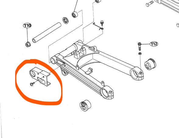 Das ist für die Querrichtung? Ne, braucht die Zero nicht. Die braucht um die Querstrebe der Schwinge eine Kunststoffschelle als Kettenschleifer, denn die Kette kreuzt die Schwinge nur an dieser Stelle, sie ist komplett innerhalb der Schwinge, nie außerhalb, bei den alten Zeros.