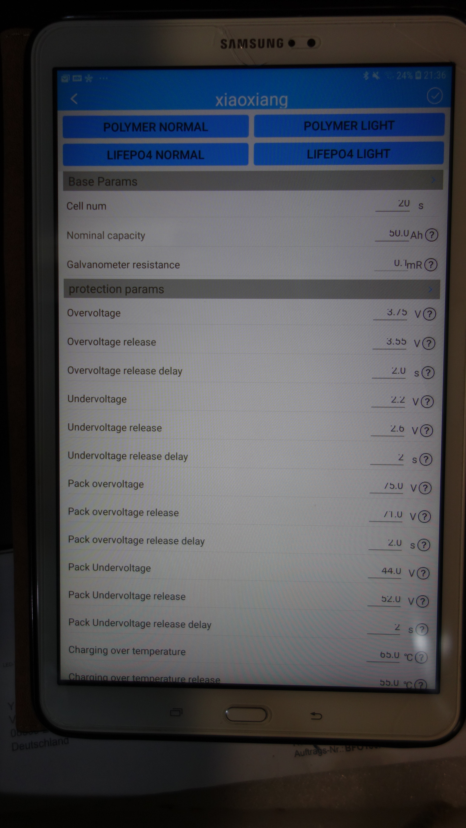 Danke für die Infodominik hat geschrieben: ↑So 7. Jul 2024, 22:14Das cell over voltage wäre mir mit 3,75V etwas zu hoch. Das Üack overvoltage mit 75V auch.