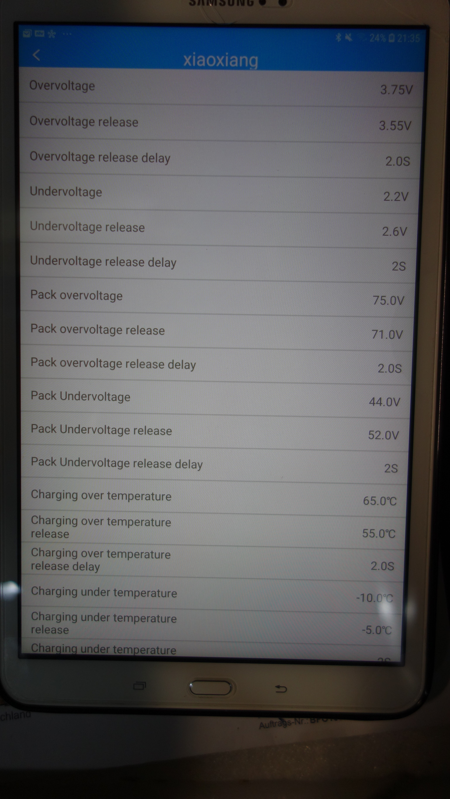 Das cell over voltage wäre mir mit 3,75V etwas zu hoch. Das Üack overvoltage mit 75V auch.
