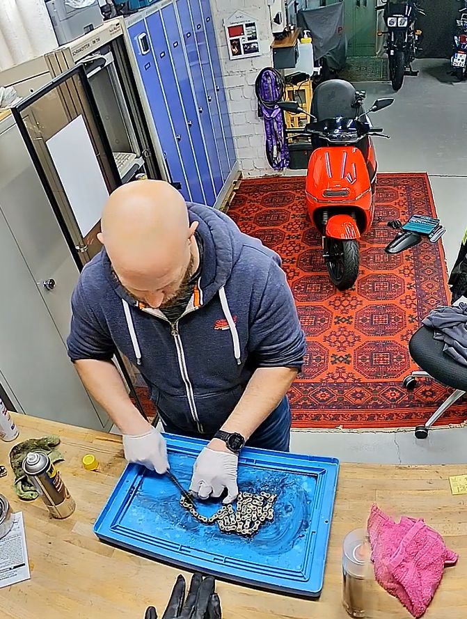 Also ich lasse zum Reinigen die Kette eingebaut und nehme ein Tuch das ich mit Ballistol tränke. Das Tuch dann mit Druck um und fest an die Kette gepresst halten und das Hinterrad drehen. Zum Schmieren das High End Kettenspray von Dr. Wack (das war ein Tipp aus dem Forum) auf die Innenseite der Kette sprühen. Dazu stelle ich die Wanne im Link unter und decke den Reifen mit einem Stück Pappe (ca. 23cm * 28cm) ab.