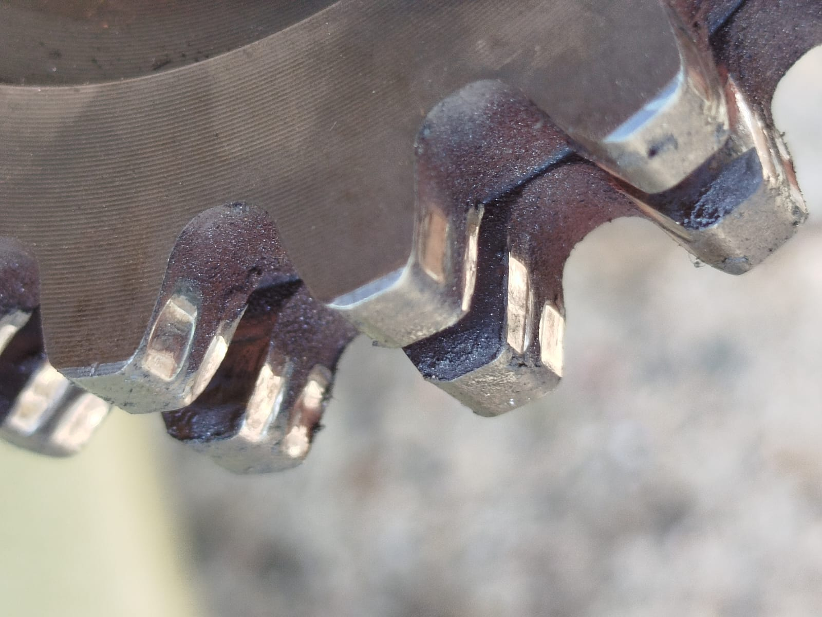Wenn ich die Bilder sehe, dann sehe ich eine trockene Kette. Kein Kettenfett, nichts. Und das gibt natürlich mächtiv Verschleiß, den man auch ohne Hinsehen erkennen kann, allein durch die unterschiedliche Geräuschkulisse beim vorwärts oder rückwärts schieben.