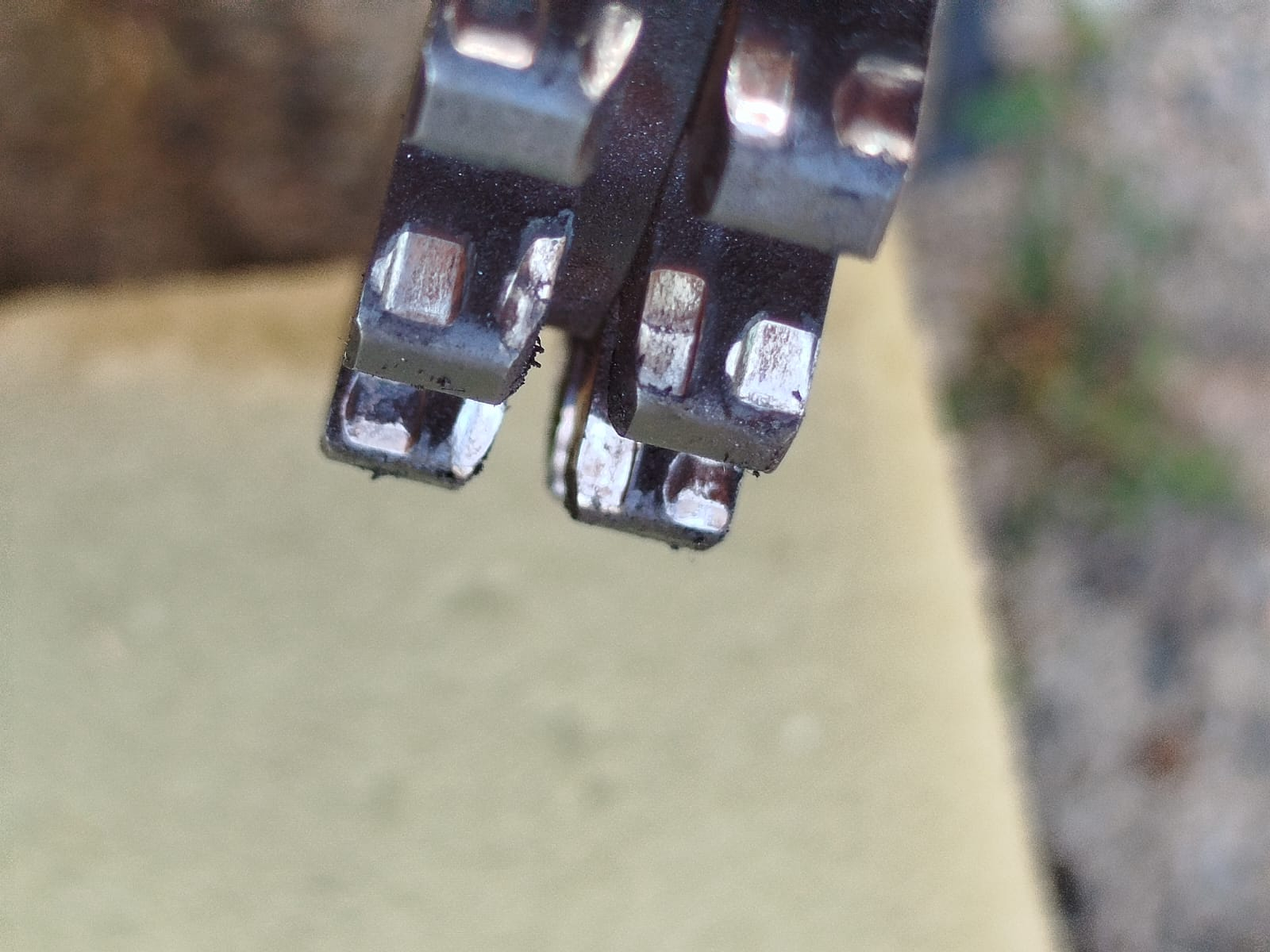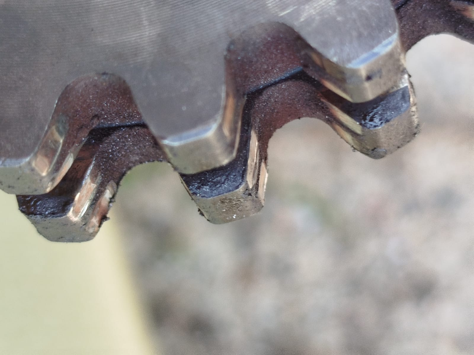 Wenn ich die Bilder sehe, dann sehe ich eine trockene Kette. Kein Kettenfett, nichts. Und das gibt natürlich mächtiv Verschleiß, den man auch ohne Hinsehen erkennen kann, allein durch die unterschiedliche Geräuschkulisse beim vorwärts oder rückwärts schieben.