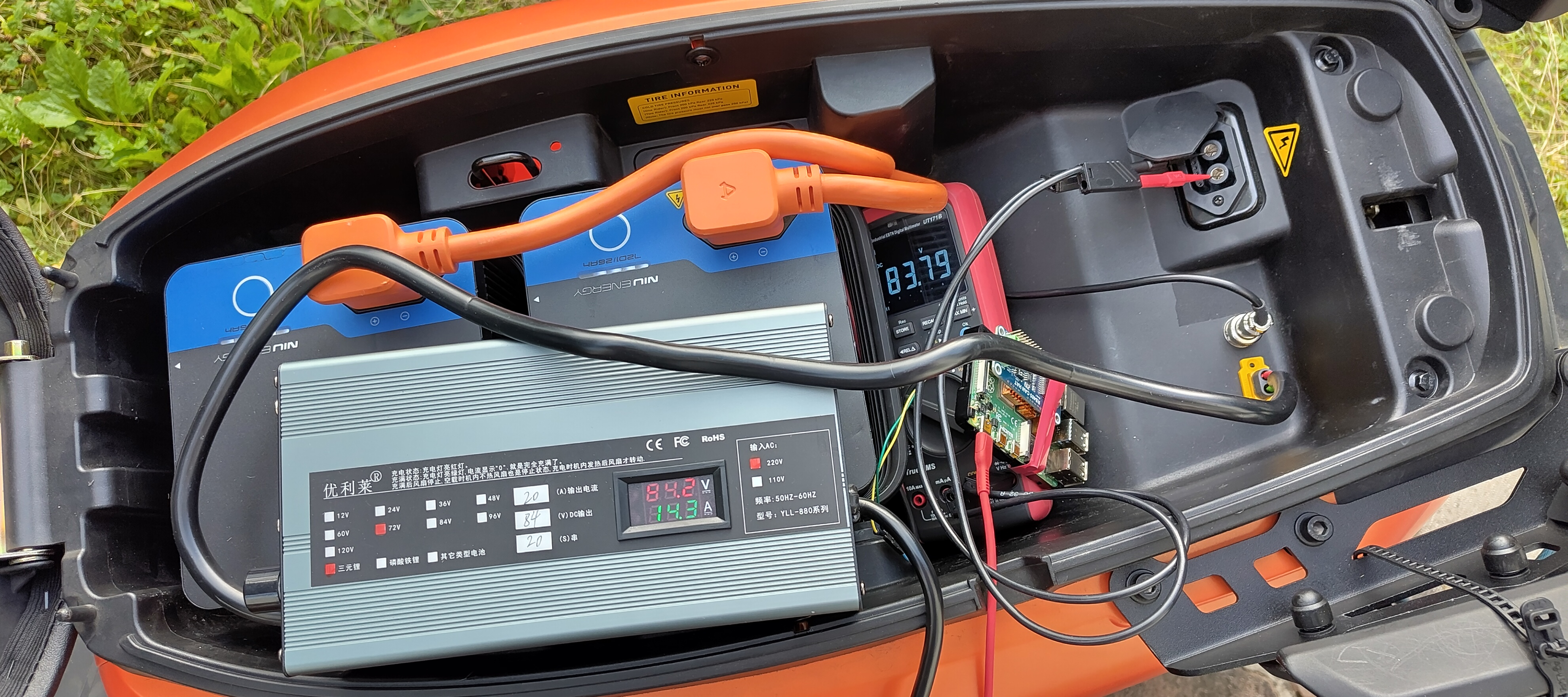 Ich habe den Roller eingeschaltet und den Lader an den bauseitigen XT60 Stecker angeschlossen der normal zur Ladebuchse geht.
