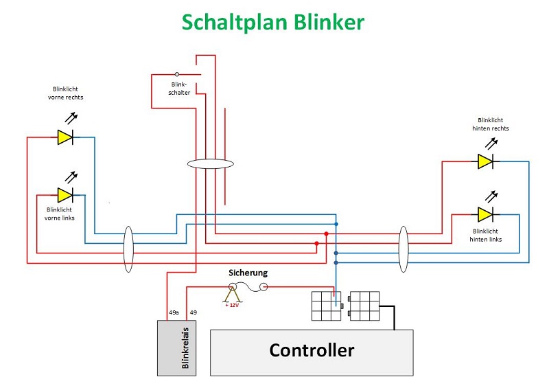 Die Verdrahtung beginnt man mit dem Einbau der Sicherung für den 12V-Ausgangs des Controllers. Anschließend die Kabel und das Blinkrelais im Controllerraum nach folgendem Plan verbinden und isolieren.