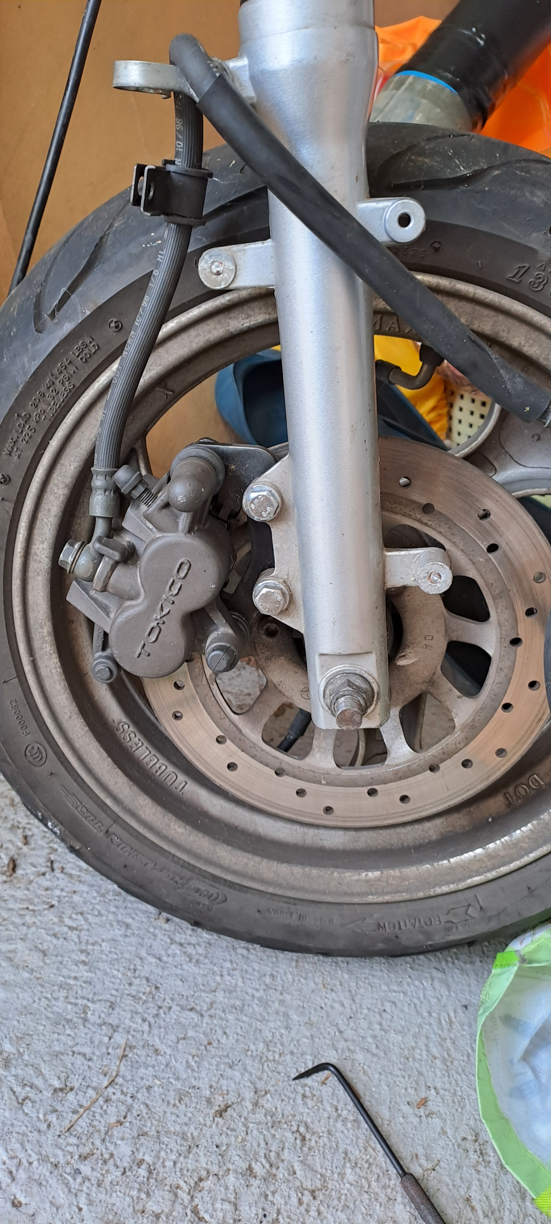 Die vom Kollegen geschenkte Tokico Bremse der SV650 passt zumindest vorne schon mal rein.