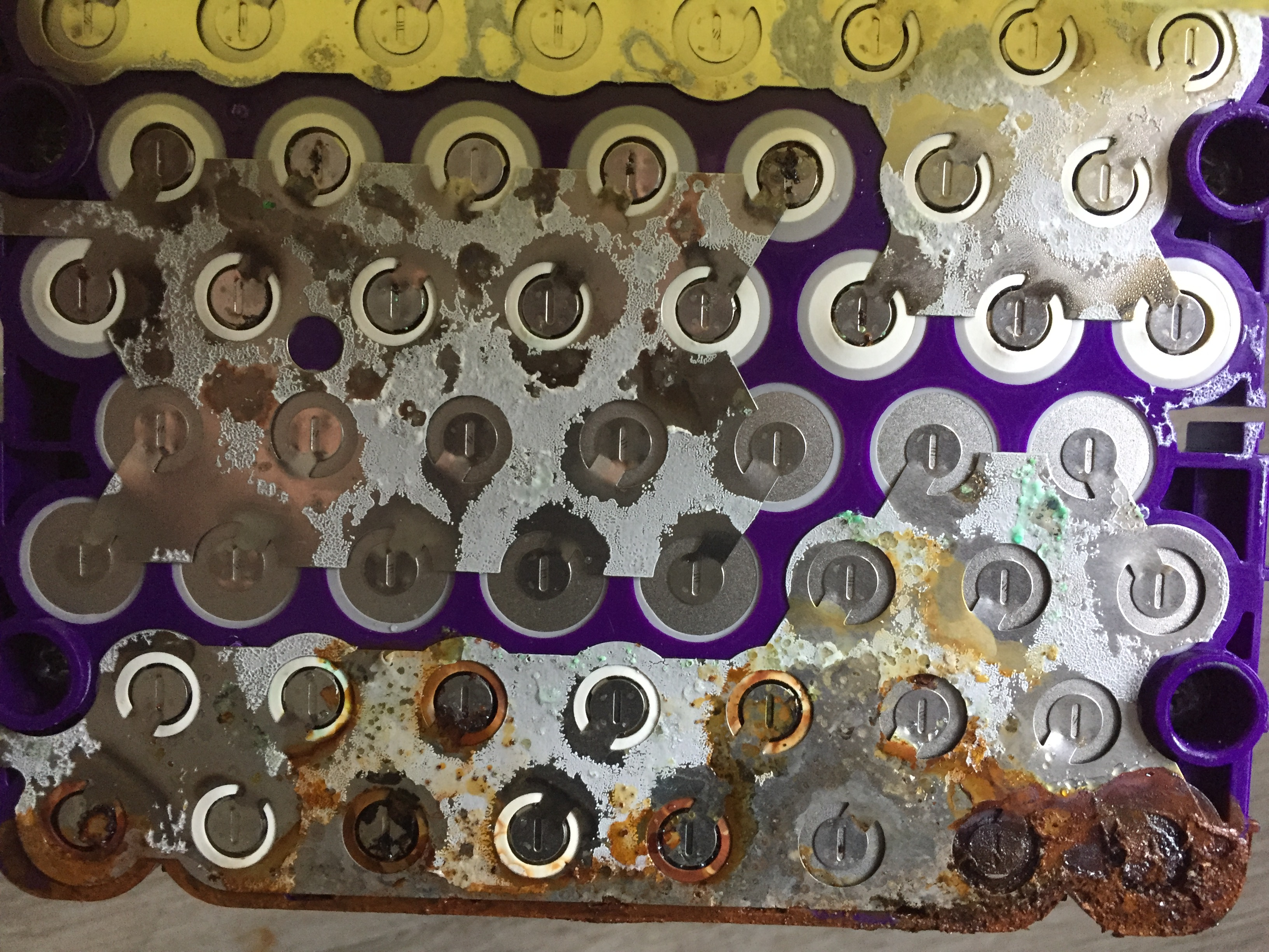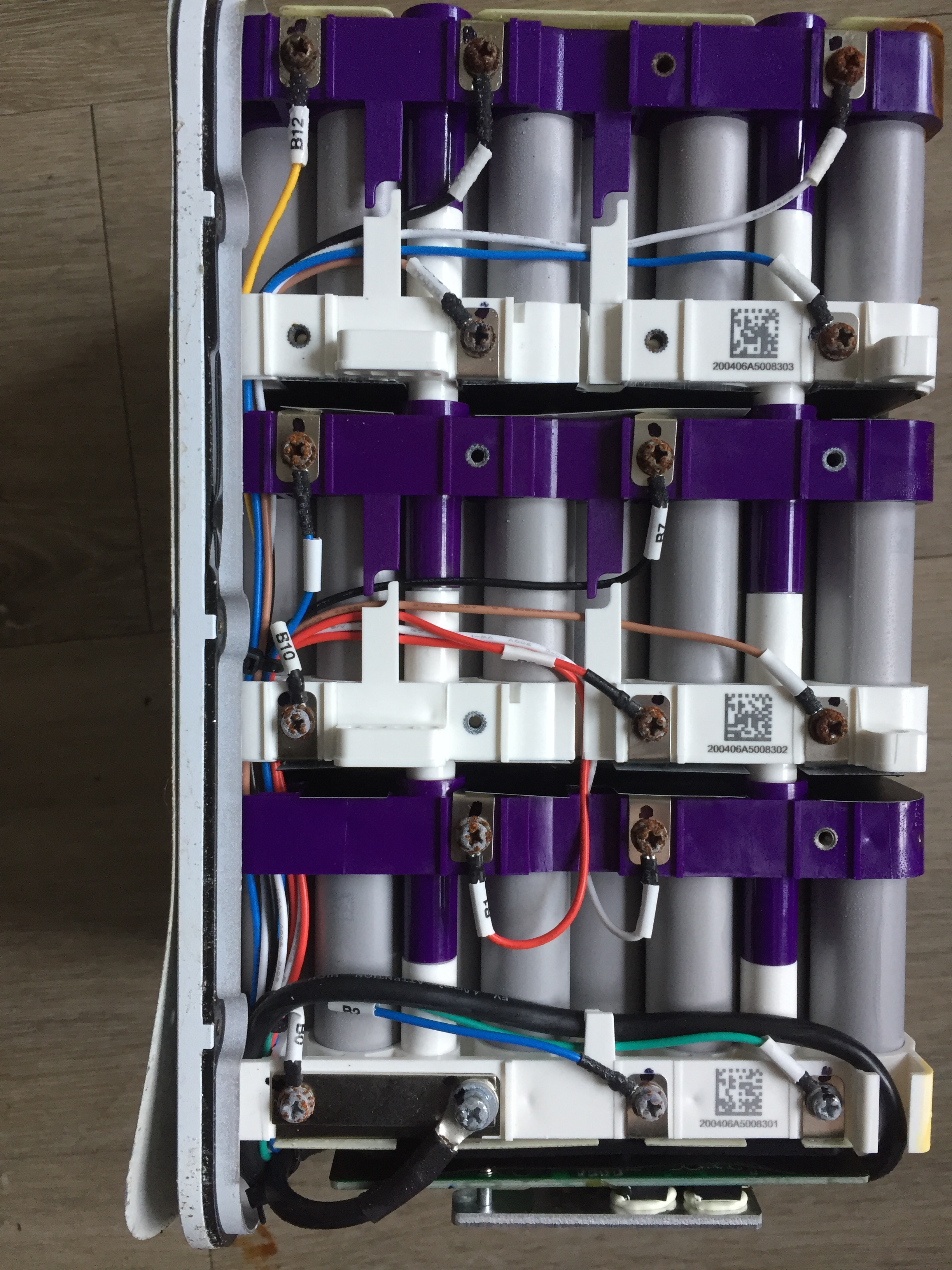 Leider funktionieren die PNs immer noch nicht. Ich denke es ist OK die Bilder offen ins Forum zu stellen. Von außen sah der Akku eigentlich ganz normal aus. Bei den leichten Rostspuren unter der oberen Klebefolie hatte ich mir noch nichts gedacht. Beim Öffnen roch der Akku dann als hätten einige Zellen ausgegast. Wie das Schadensbild entstanden ist? Keine Ahnung. Der Roller selbst ist völlig OK und fast neuwertig.