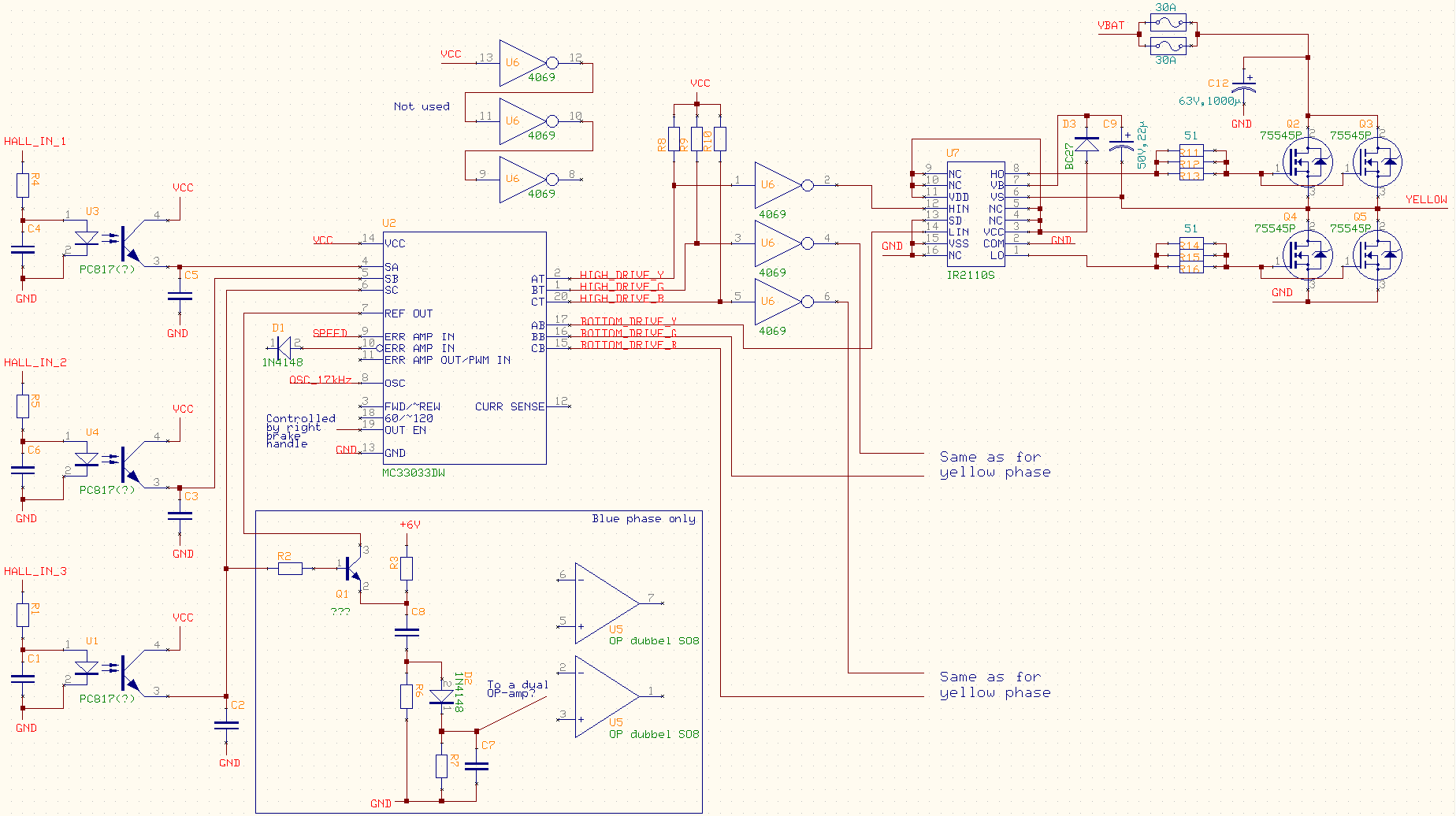 - Zum Motor gehen 6 dünne Kabel, 5 davon für die Hallsensoren, Nr. 6 ist ggf. Temperaturfühler? Könnte man im Zweifelsfall weglassen