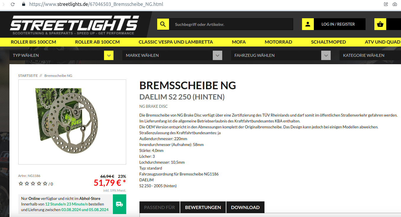 .... leider nur "nicht verfügbar". Die ist von NG, einem spanischen Bremsscheibenhersteller, und hat eine bessere Qualität. Allerdings wies sie auch leichte Passungenauigkeiten bei den Bohrungen auf. Aber mit etwas Gewalt konnte man die Halteschrauben reindrehen.