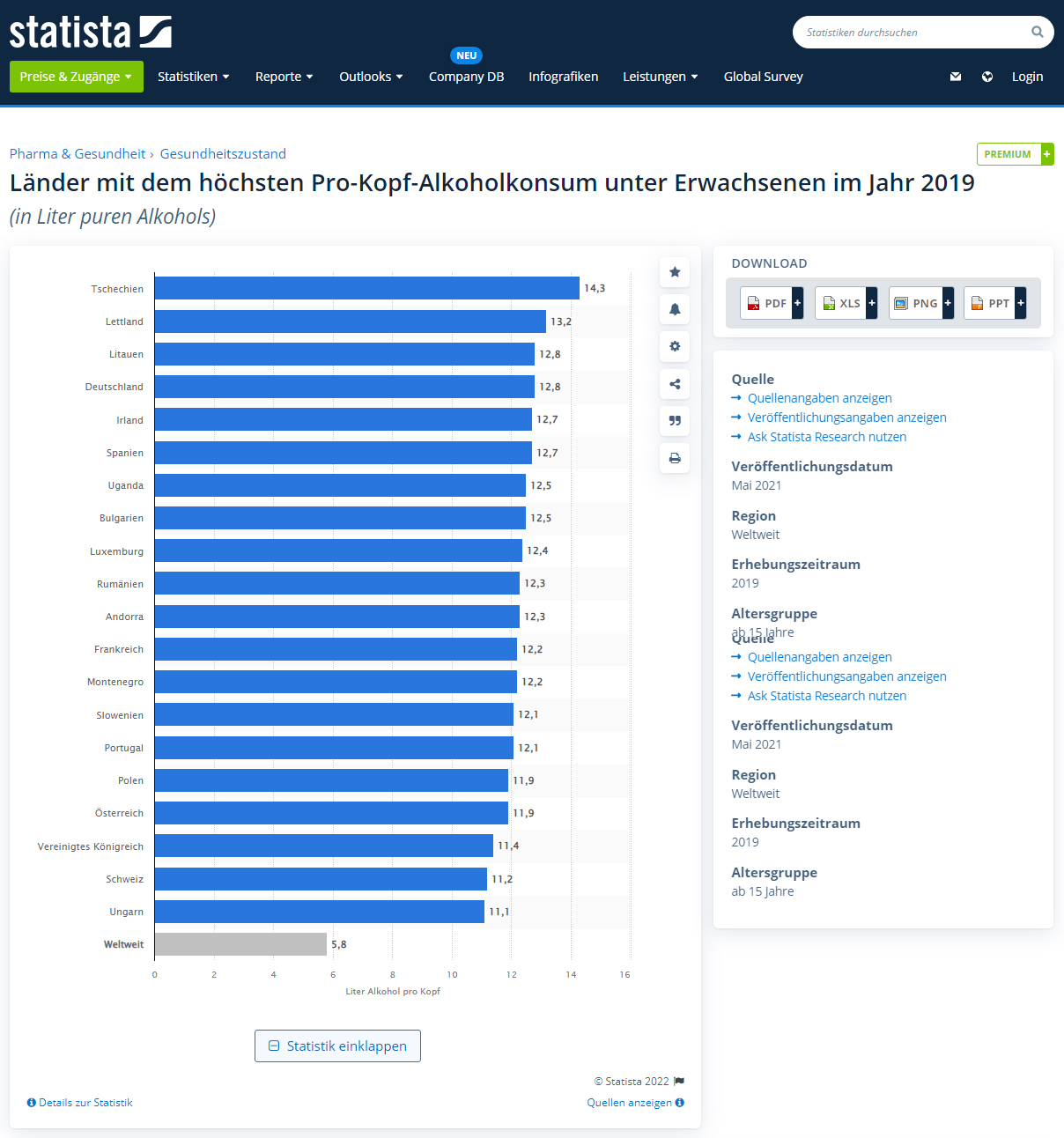 Alkoholkonsum pro Kopf weltweit 2016 Alkoholkonsum pro Kopf weltweit 2019 Bei 193 Ländern weltweit haben wir uns inzwischen von Platz 5 auf Platz 4 "hochgearbeitet".