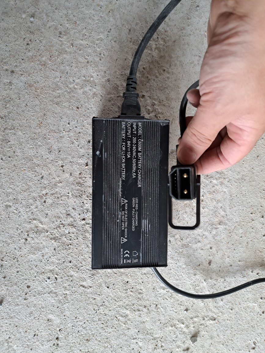 Das normale Ladegerät mit ca.900W, wird am Hinterrad angesteckt.