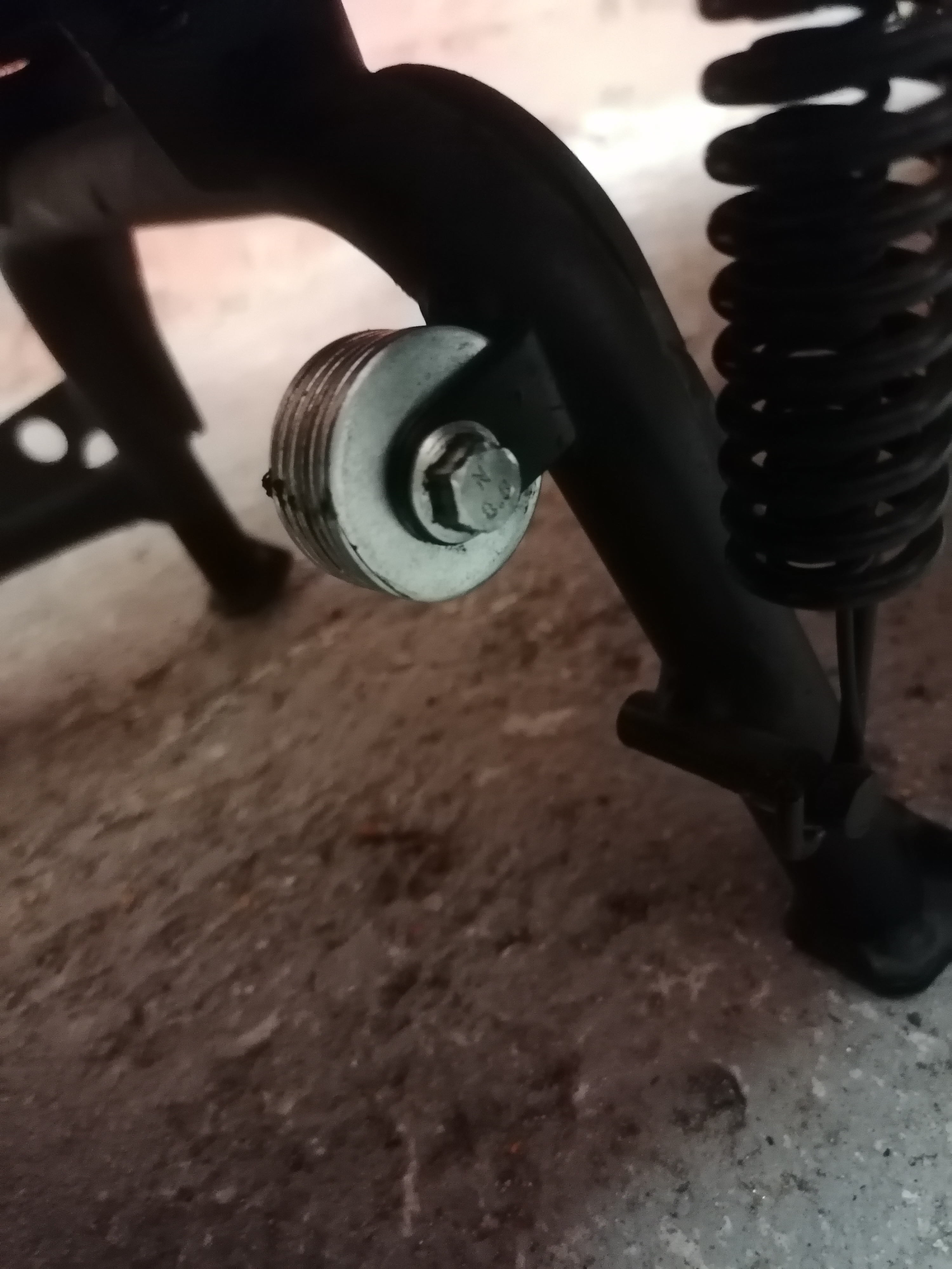 Was mir auffiel, dass das eigentliche Anschlaggummi für den Hauptständer bei mir schon recht ausgefranst aussieht. Da reibt bei jeder Federbewegung diese Gleitrolle lang. Mangels Schmierung gleitet da nix mehr, sondern gräbt nur noch (ins Gummi).