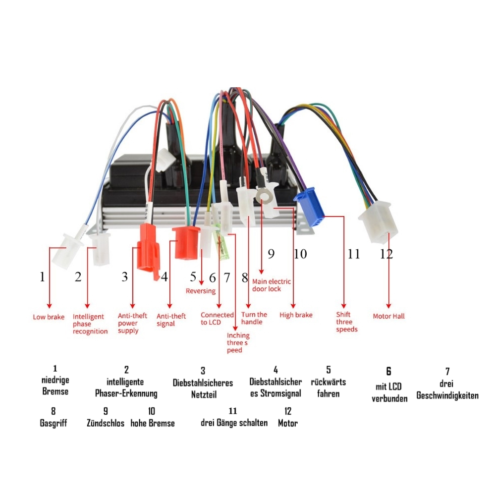 11. Anschluss für Schiebeschalter Fahrstufe low , Mittel, Fahrstufe high