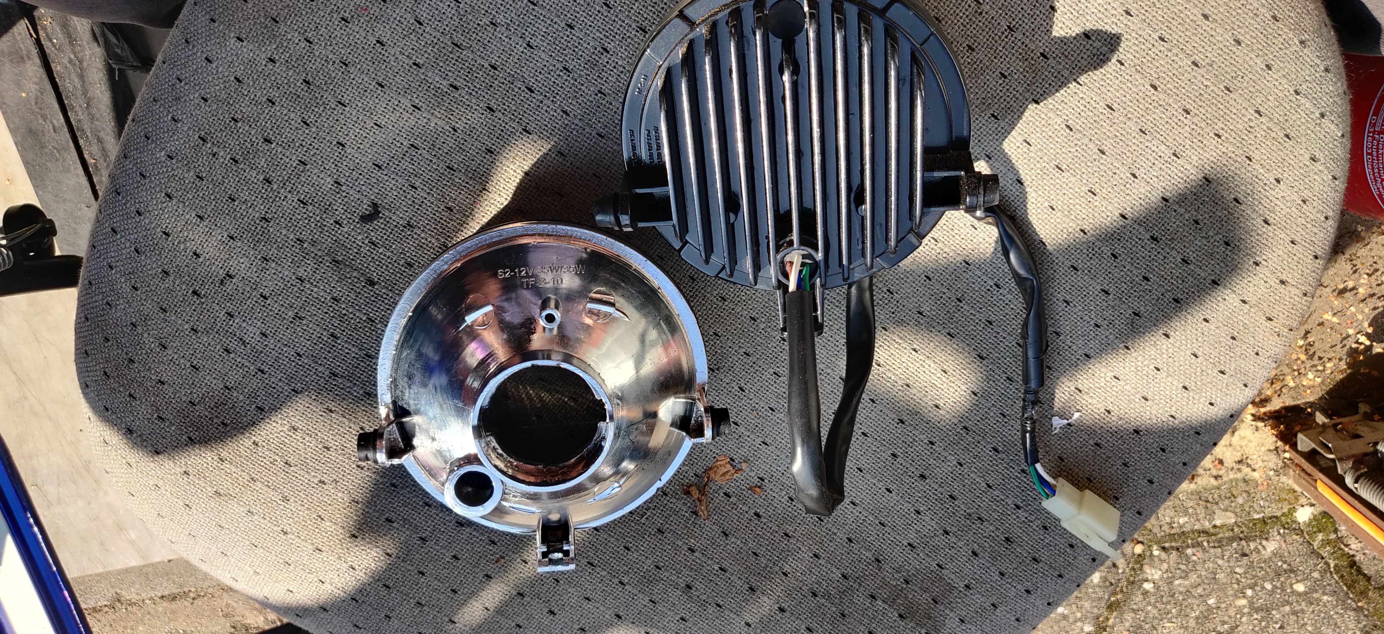 Tacho wieder drin, kleine Schrecksekunde, das grüne Licht kommt nicht und der Gasgriff reagierte nicht, alles nochmal gelöst und wieder zusammen, nun geht alles wieder. Vielleicht ist das auch mein sporadischer Ausfall, der Stecker, die Pins und beide Kabel werde ich wohl noch mal genau unter Augenschein nehmen. Bei der Gelegenheit gleich mal den Scheinwerfer LED vom Nova schnell mechanisch montiert, das sieht ganz gut aus.