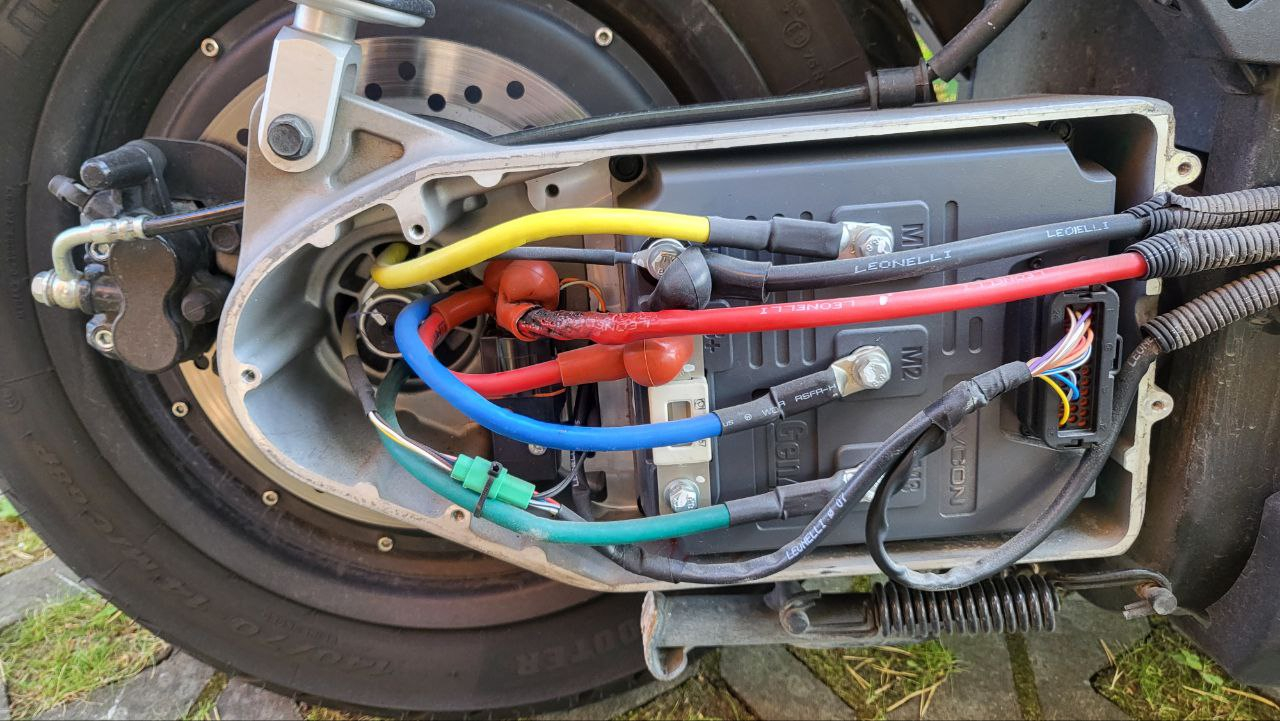 Wow: Spitzenleistung bis 9000 Watt, macht fast 190 Amps. Kein Wunder, dass auf den Fotos bald fingerdicke Leitungen zu sehen sind. Und ich dachte, mein Niu Mqi GT braucht mit seinen 48 Volt schon Querschnitt und XT90 damit es nicht kokelt, aber hier sind ja noch einige Elektronen mehr am Start. Da braucht man diese Lautsprecherleitungen aus den fahrbaren Stereoanlagen (12 V und Querschnitt hört man wenn sie vorbeifahren: umms umms umms)