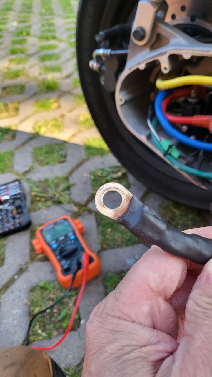 Da haben die Arbeitsströme der vergangenen Wochen sicherlich das Ihre getan und durch thermische Arbeit den Roller heute zum Stillstand gebracht. Ich habe dann natürlich alles fein gesäubert (ein neuer Polkappenschutz kommt morgen noch drauf), mit einer zusätzlichen Unterlegscheibe zwecks grösserer Kontaktfläche komplettiert, mit (schwarzem) Schrumpfschlauch neu ummantelt und jetzt läuft wieder alles nach Plan.