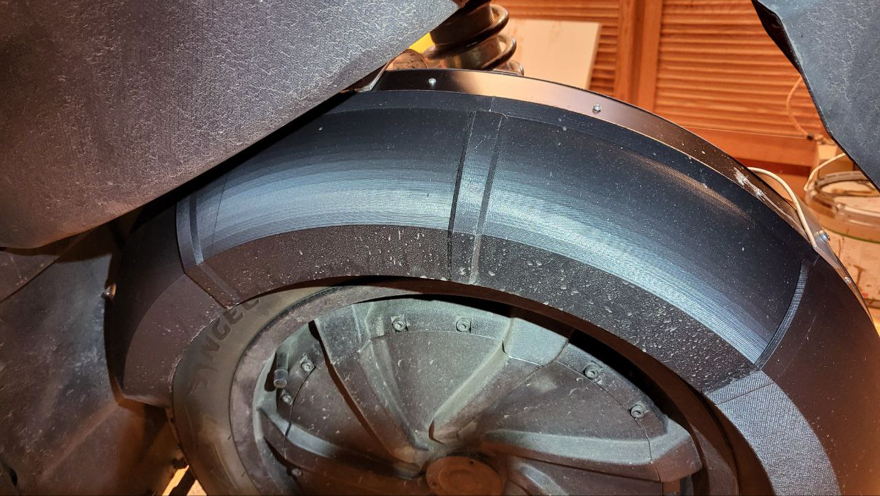 Ich habe in Zusammenarbeit mit @m···@wrmueller.de , der für die Konstruktion steht, einen in Segmente aufgeteilten Spritzschutz ausgedruckt, diese zusammengefügt und hier sieht man das Ergebnis. Rechts im Bild ist der "vordere" Spritzschutz zu sehen den @WRmueller bereits früher konstruiert hat und der bei einigen offenbar erfolgreich im Einsatz ist. Den Alu-Flachstab zut Versteifung habe ich mit Blindnieten angenietet.