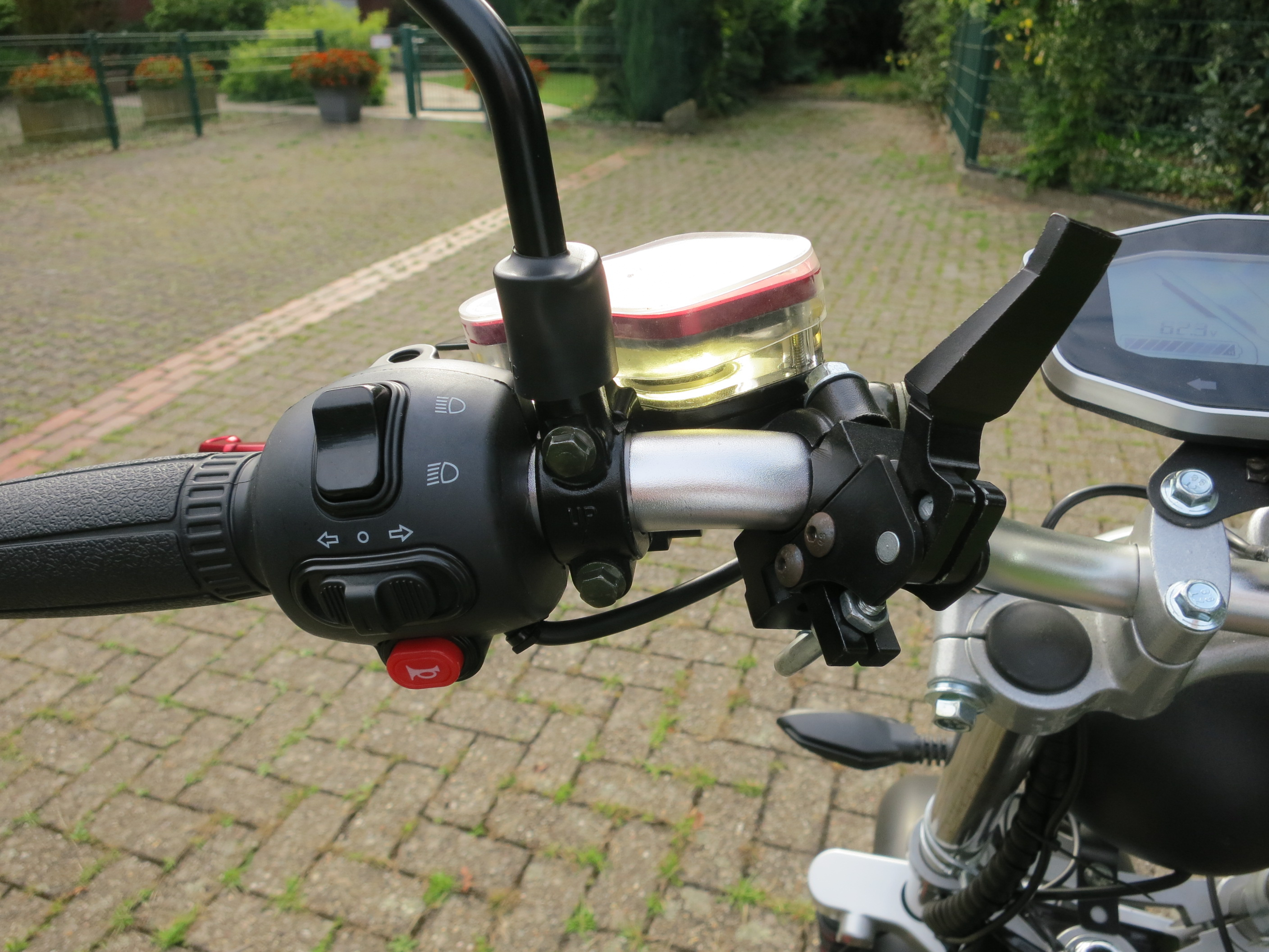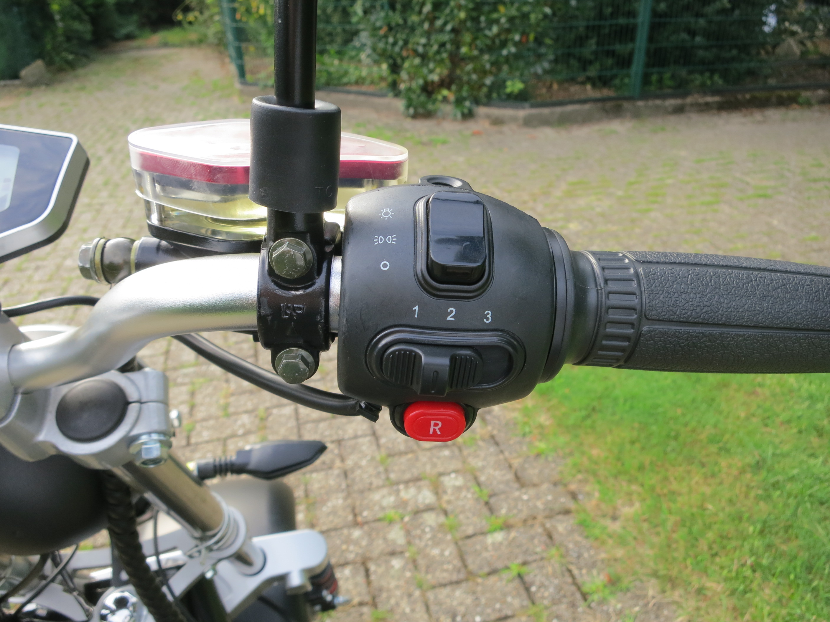 "Gas", Lichtschalter, die 3 Fahrstufen (werden im Tacho angezeigt) und Rückwärsttaste.