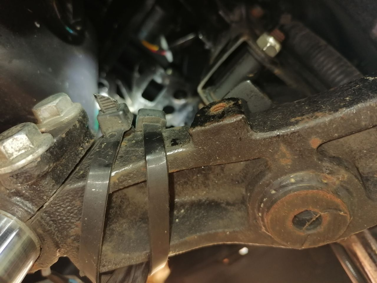 Tatsächlich beschränkt sich der Rost auf die Teile, bei deren Ansicht ich im Frühjahr Schlimmstes erahnt hatte. Die Schwinge ist pickelig und das Gabeljoch hat etwas Flugrost, auch die Ständer. Aber die sind auch exponiert. Die Rahmenrohre unter der Verkleidung und von unten hingegen fast nichts, hier und da, wo etwas gescheuert hat und hier und da Minipunkte in Mulden an Schweißpunkten: