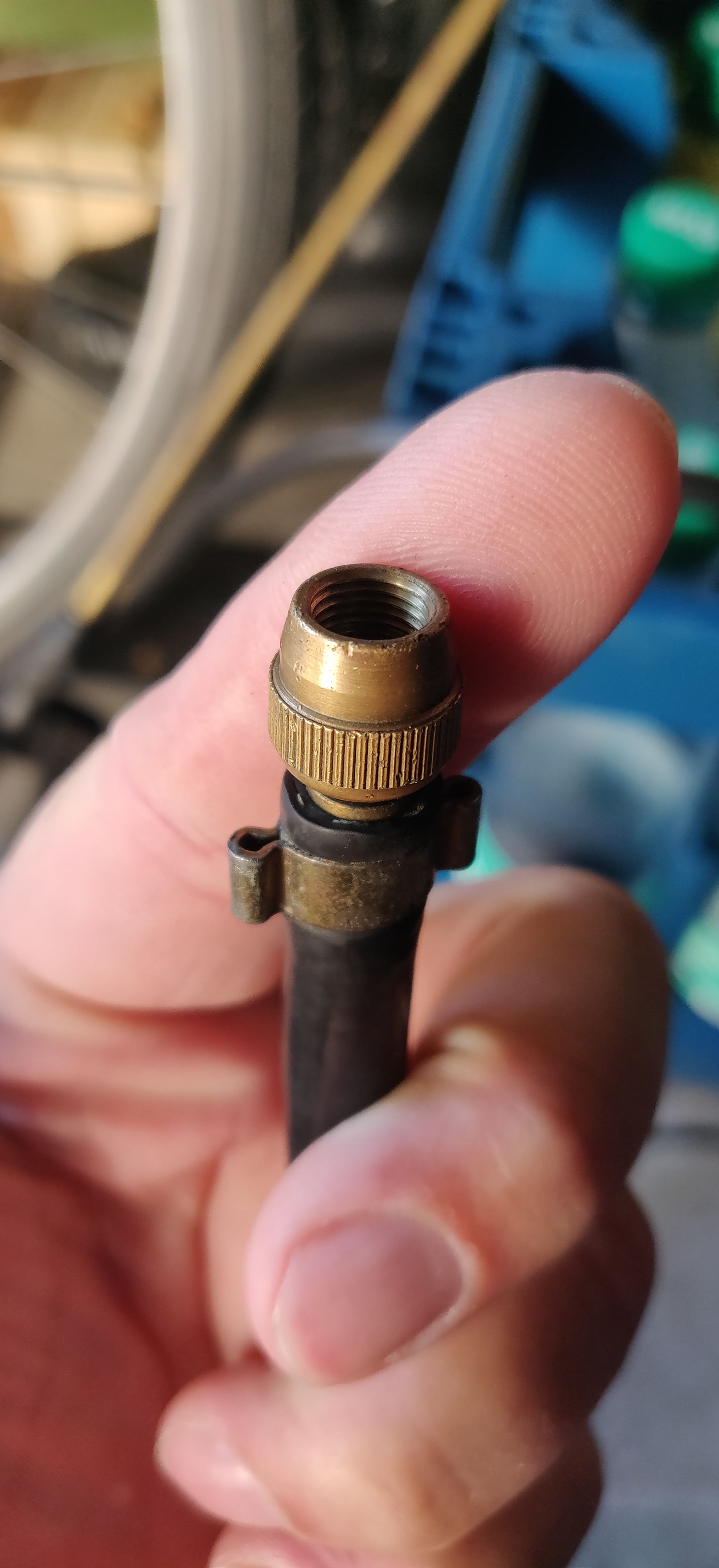 Vom billigsten Autokompressor der Kopf ist nur eine Mutter wie die Ventilkappe und dann Gummischlauch. Ich habe schon seit 15 Jahren einen vom Smart, der geht auch gut beim Bollerwagen.