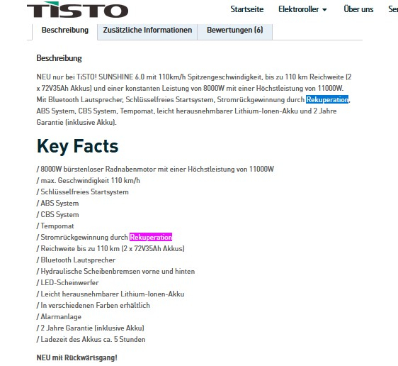 Kam der Roller damal aus China allerdings ohne aktivierte Rekuperation an, weil es ggf. im aktivierten Zustand schon mal Schadenfälle (Garantieleistung) beim Akku gab, der die Zusatzbelastung doch nicht vertragen hat, ist das natürlich eine dumme Sache. Das muss natürlich aus der Werbung raus, oder es wäre eine zugesicherte Produkteigenschaft, die der Händler nicht erfüllt hat. Die spätere Aktivierung seht der Hersteller-Garantie (weil nachträgliche Produktveränderung) entgegen. Und ein Schaden am Akku, der erst im Laufe der Nutzung, durch die Stromstöße bei Rekuperation entsteht, ist dann auch kein Händler-Gewährleistungsfall sondern Verschleiß in Kundenhand.