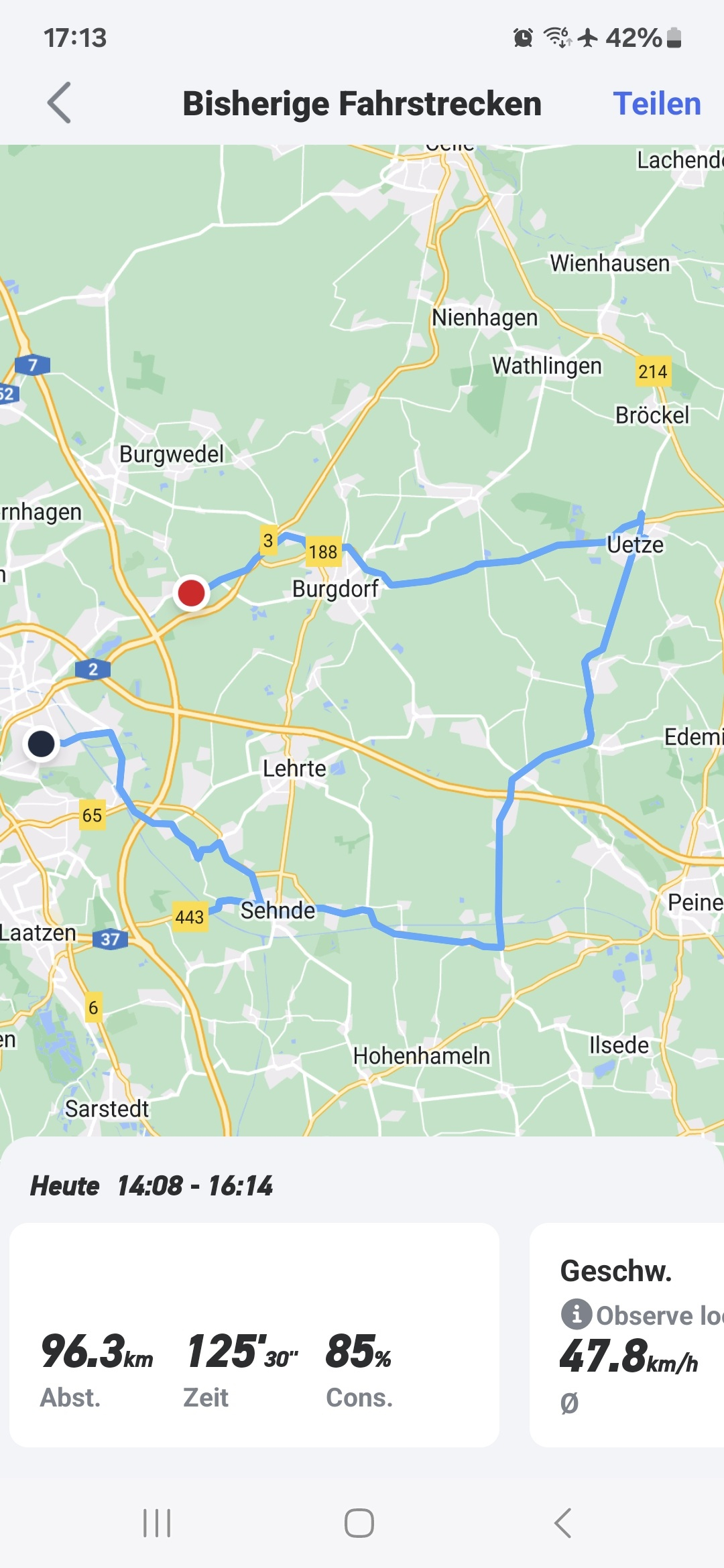 Aber er hat schon abgebaut. Als er neu war bin ich von Hannover an die Ockertalsperre gefahren. Dort aufgeladen und wieder zurück mit fast vollem Akku. Das schafft er heute nicht mehr.