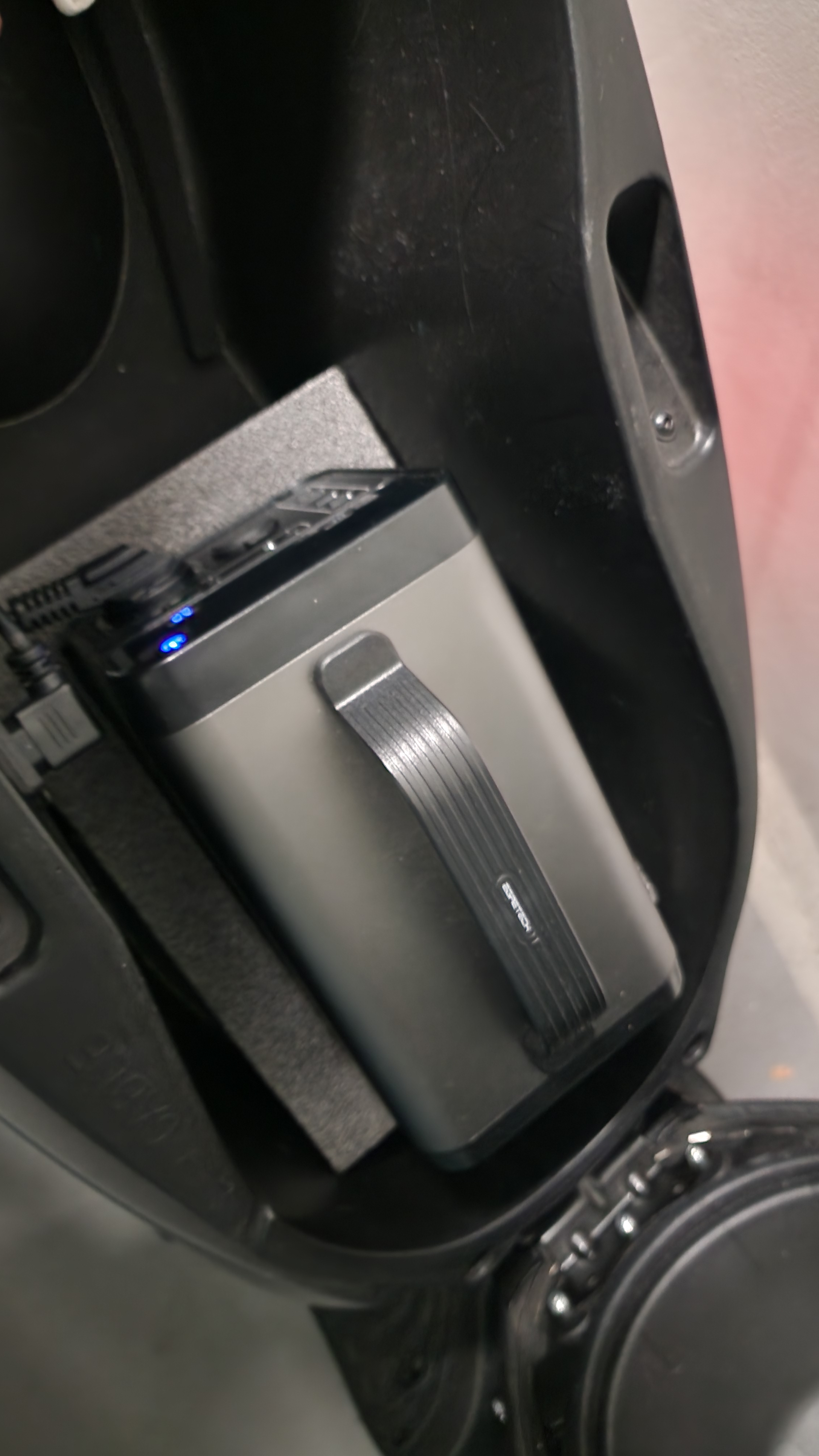 Die Abmessungen sind so klein, dass es samt Vibrationsschutz in den vorderen Teil unter dem Sitz passt und 5 kg Gewicht sind für diese Kapazität auch super.